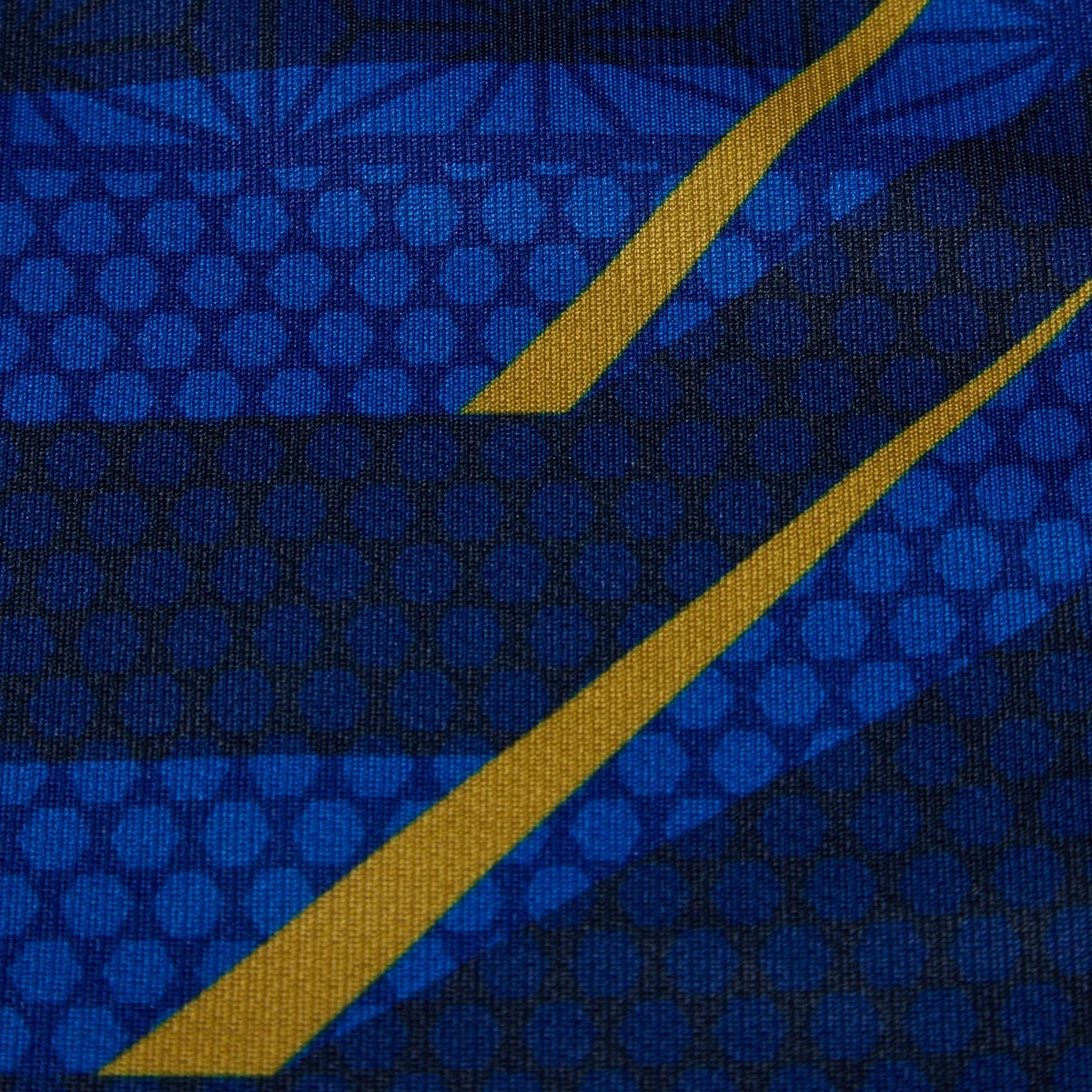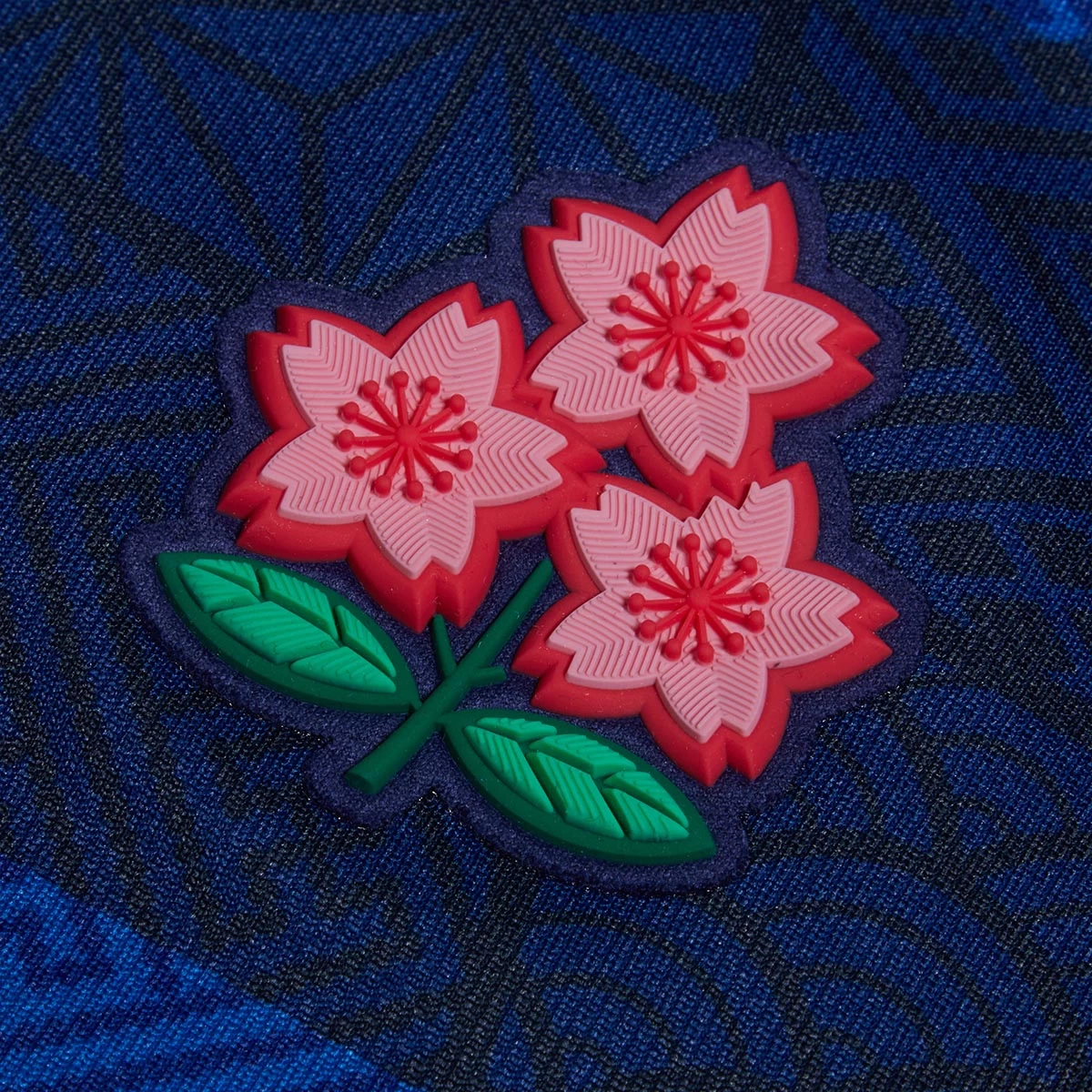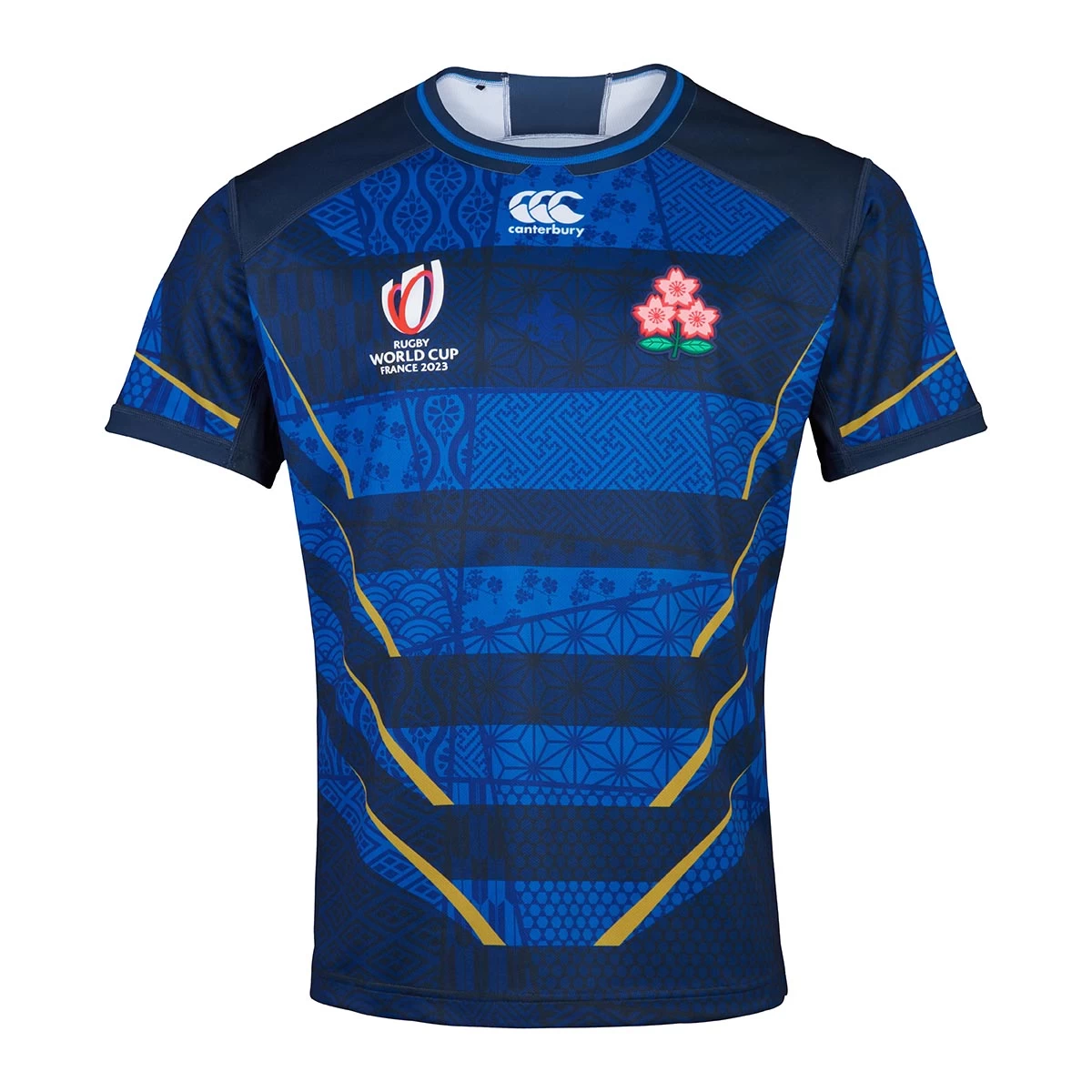 The shirt features a dark blue twist on the stripes with gold accents over a classic Japanese pattern. The upper chest of the shirt proudly shows off the puff print Japanese Rugby logo over the heart alongside the Rugby World Cup and Canterbury logos on the upper chest. Â The middle of the upper chest shows off the fleur-de-lys as a sign of respect to the tournament hosts, France.