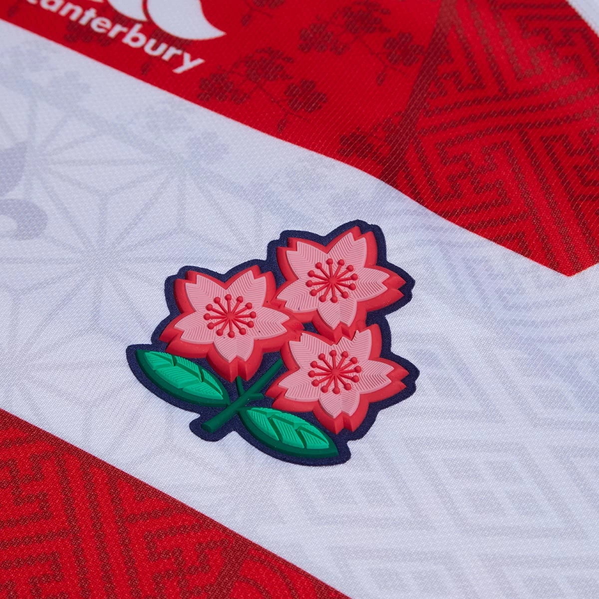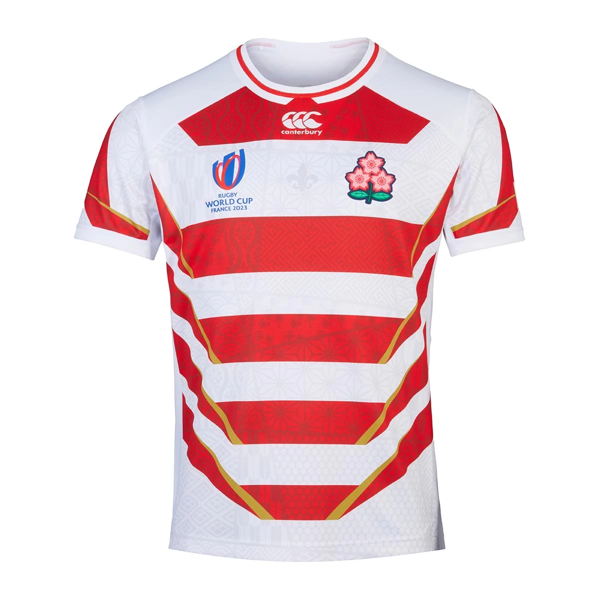 The shirt features a twist on the classic red and white striped kit with gold accents over a classic Japanese pattern. The upper chest of the shirt proudly shows off the puff print Japanese Rugby logo over the heart alongside the Rugby World Cup and Canterbury logos on the upper chest. The middle of the upper chest shows off the fleur-de-lys as a sign of respect to the tournament hosts, France.