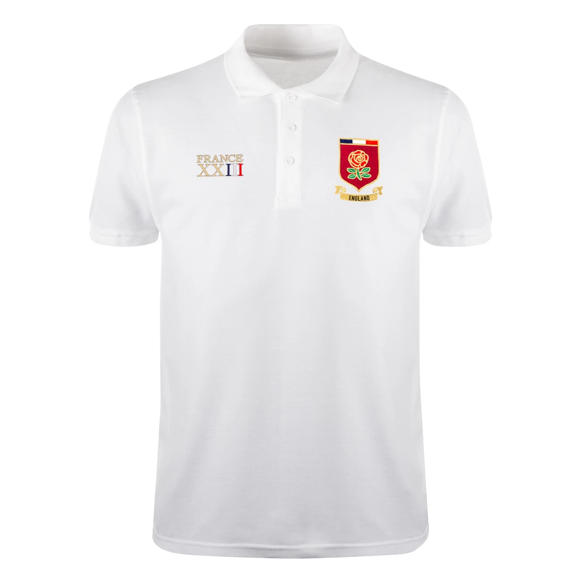 Made from ring-spun cotton, this France XXIII Collection polo shirt is perfect for backing the England rugby team this World Cup season. This classic, semi-fitted polo is cool and comfortable with a button up collar and ribbed sleeve cuffs – making it ideal for those wanting a more classic and traditional look. This white short-sleeved polo proudly shows off the England crest and the France XXIII Collection logo embroidered on the upper chest.