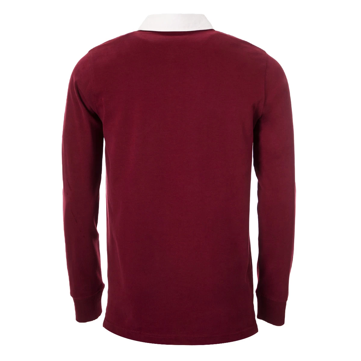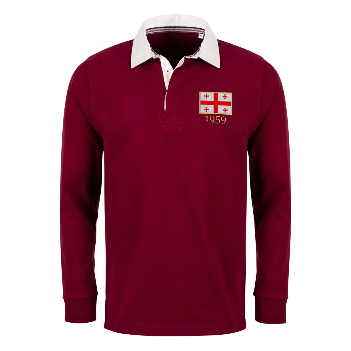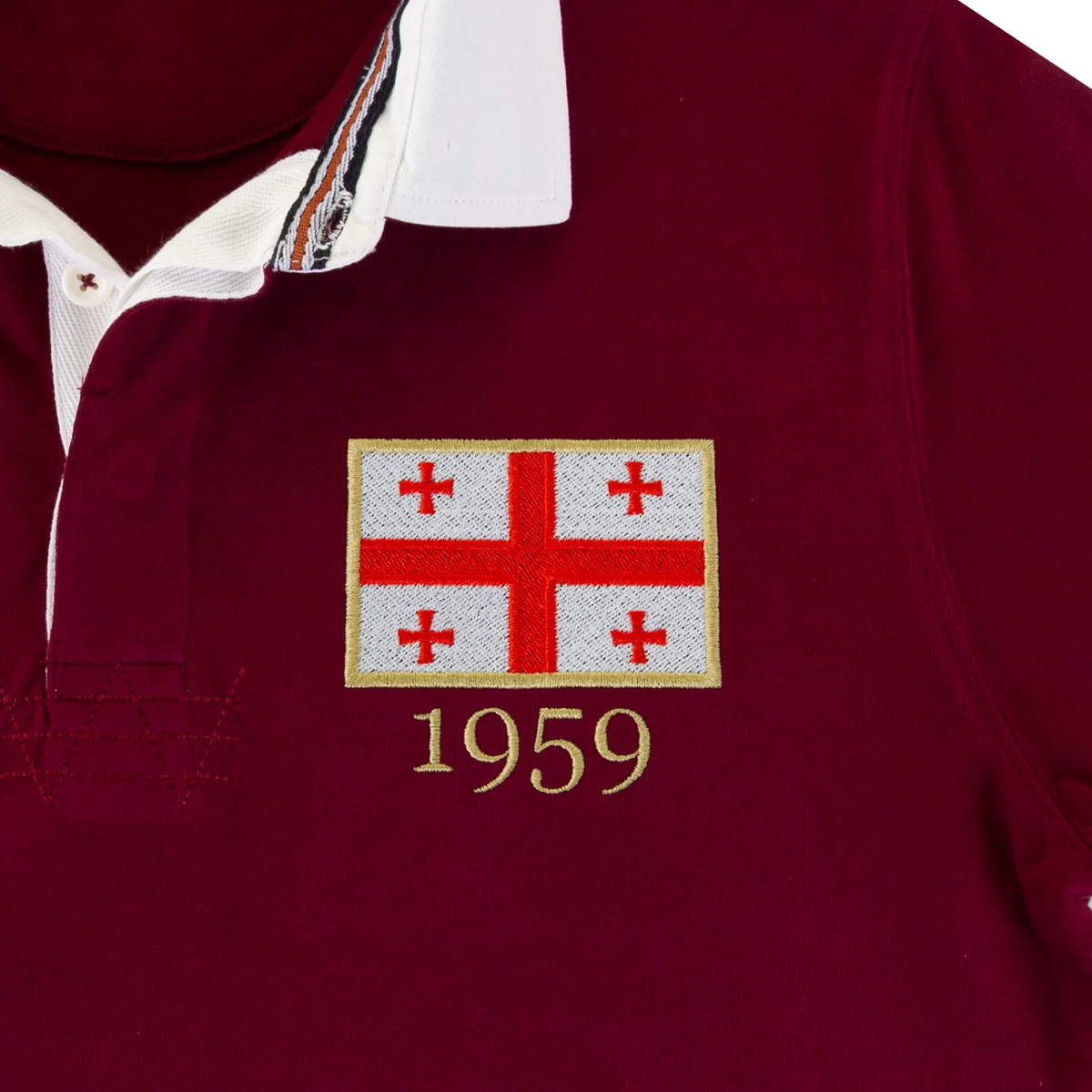 This comfortable long sleeve shirt is made from heavyweight cotton and features a button up collar to complete a traditional rugby look with a super soft finish. Perfect for wearing out and looking smart while showing support for your country this season. This burgundy heavyweight shirt displays the Georgia rugby emblem embroidered alongside 1959 – the year rugby originated in Georgia.