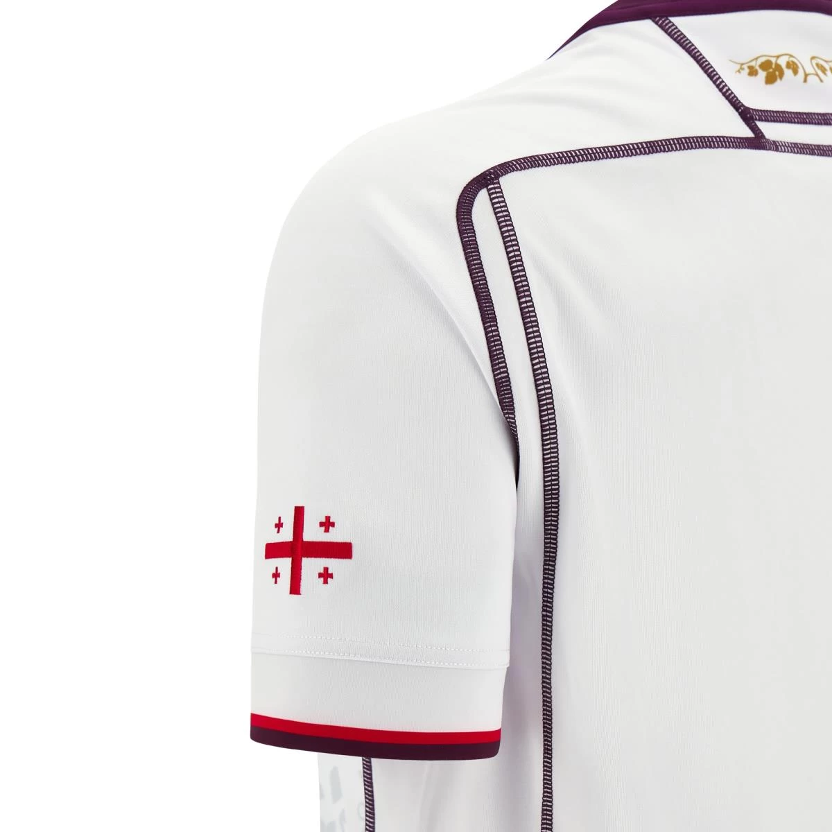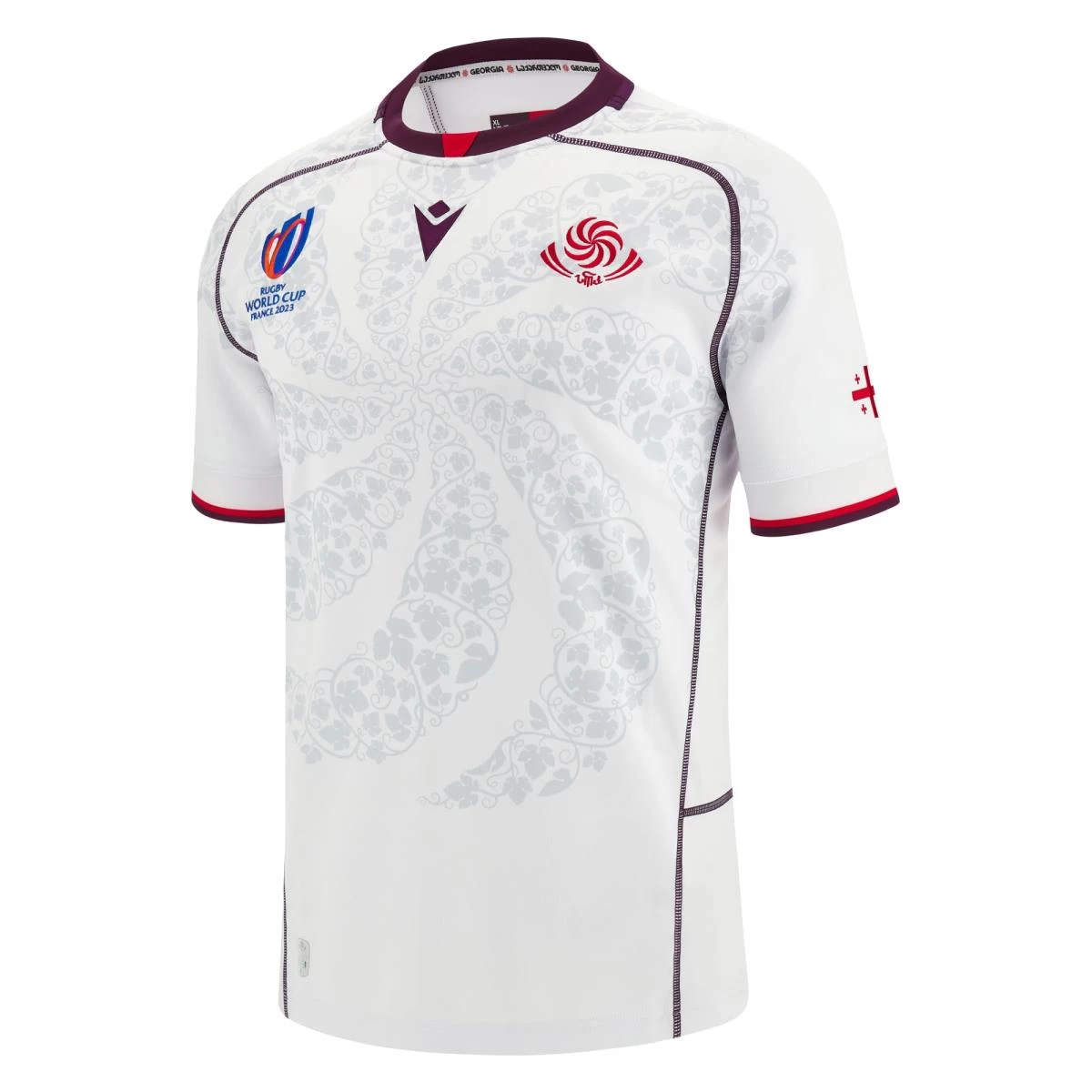 The rugby shirt features the swirl of the Georgian Rugby logo in the design on the front of the white shirt. The upper chest of the shirt proudly shows off the Georgia Rugby logo over the heart alongside the RWC and Macron logo on the upper chest.