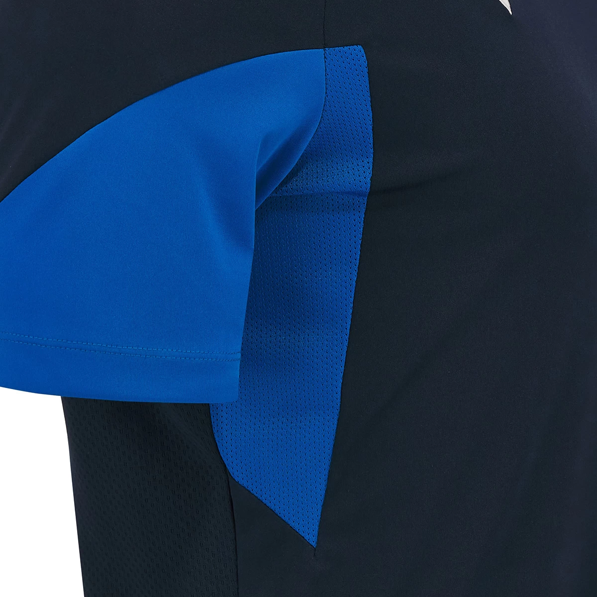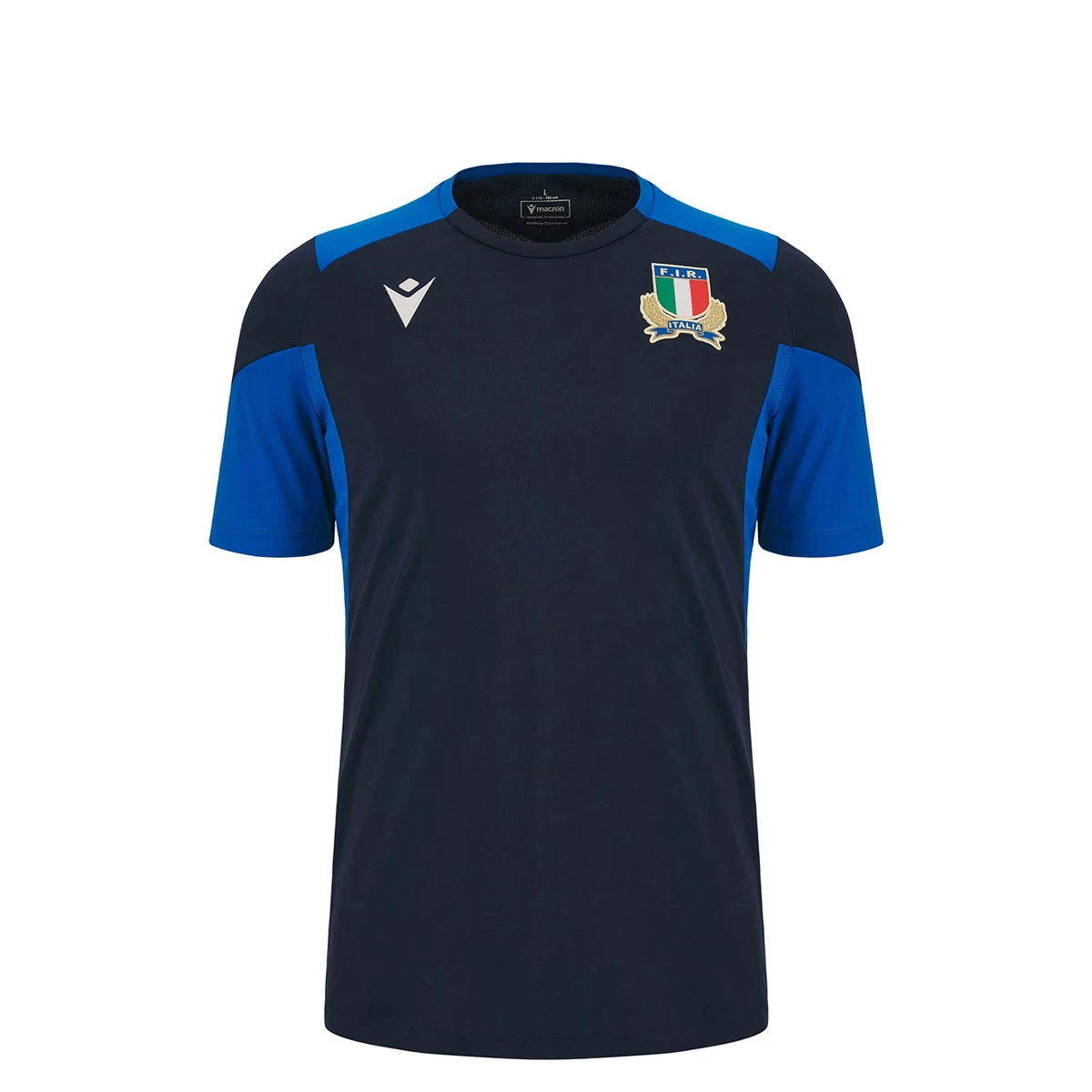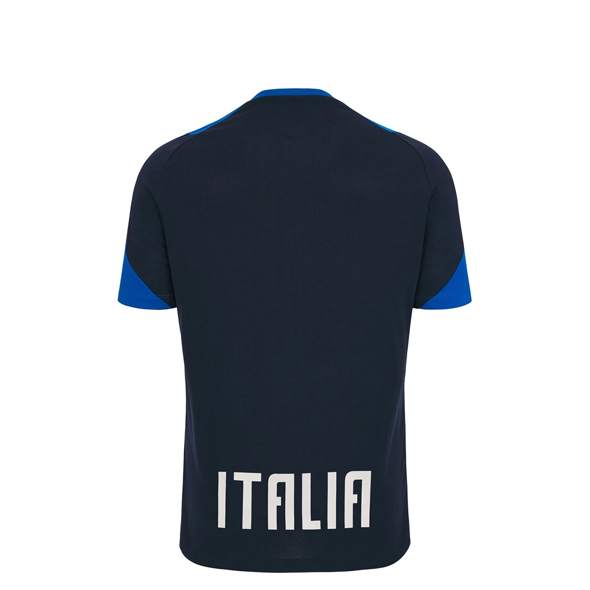 The navy T-Shirt features royal blue colour panels. The back of the shirt shows off the Italia wording along the lower back. The upper chest of the T-Shirt proudly shows off the Italy Rugby logo over the heart alongside the Macron logo on the upper left chest.