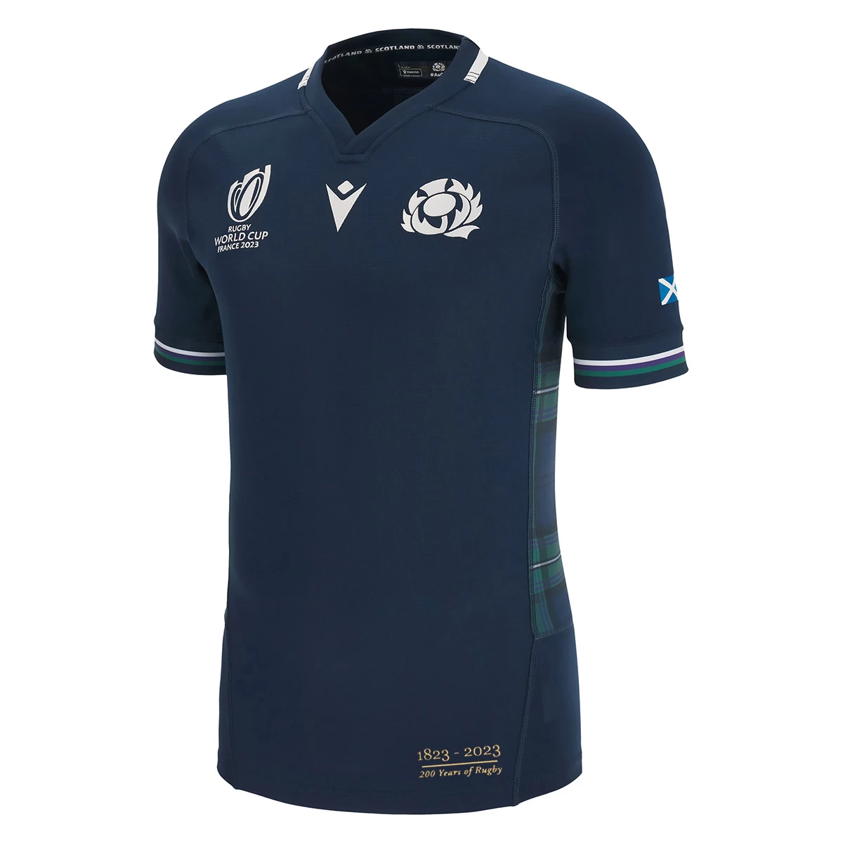 This Macron Scotland Mens Rugby World Cup 2023 Bodyfit Home Rugby Shirt is ideal for supporting Scotland this RWC season as part of your every-day style in France and beyond.