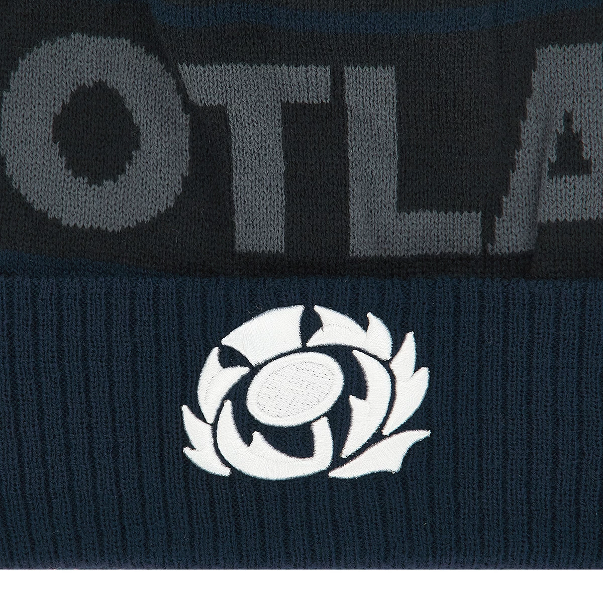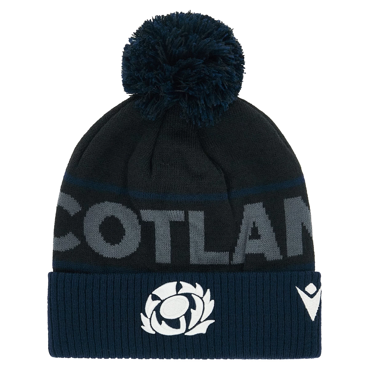 This Macron Scotland Adults Pom Pom Beanie in navy and black is ideal for wearing as part of your every-day style while supporting the Scotland team from Murrayfield and beyond. The navy and black beanie hat is made from 100% acrylic to keep you warm while supporting the team.
