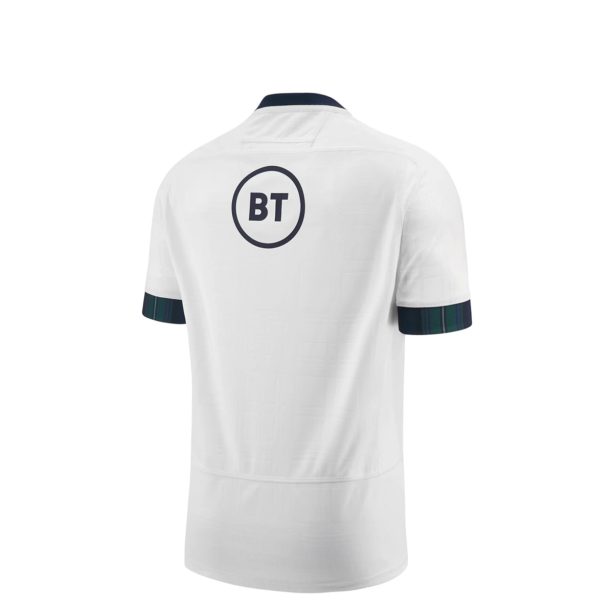 The shirt features SRU tartan sleeve cuffs to match the home shirt. The upper chest of the shirt proudly shows off the embroidered Scottish Rugby logo over the heart alongside the Macron logo on the upper left chest.