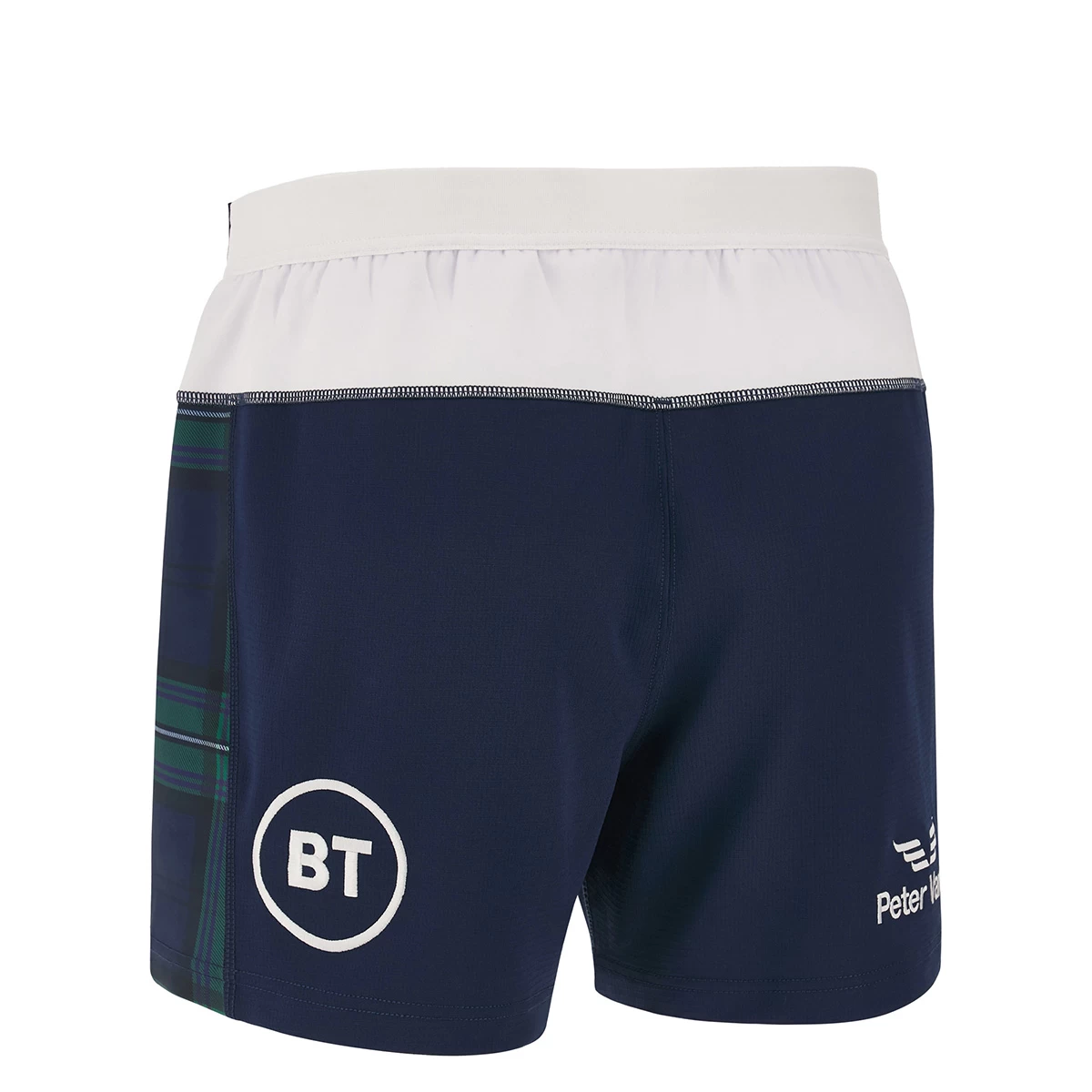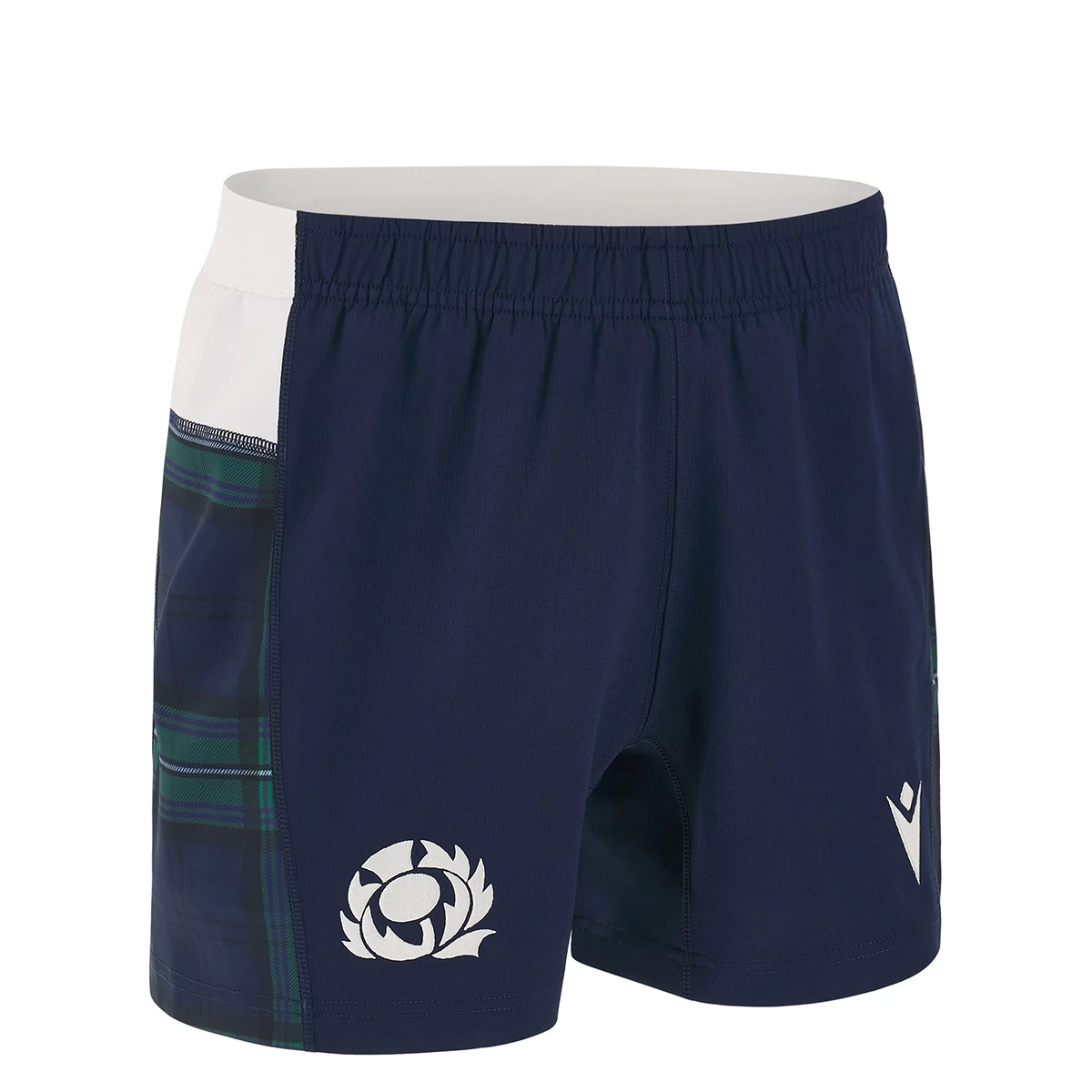 The shorts feature Scottish Rugby Union tartan detailing on each side to match the shirt. The lower thigh of the shorts proudly shows off the embroidered Scottish Rugby logo alongside the Macron logo.