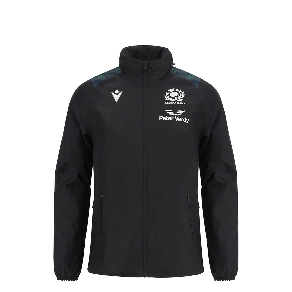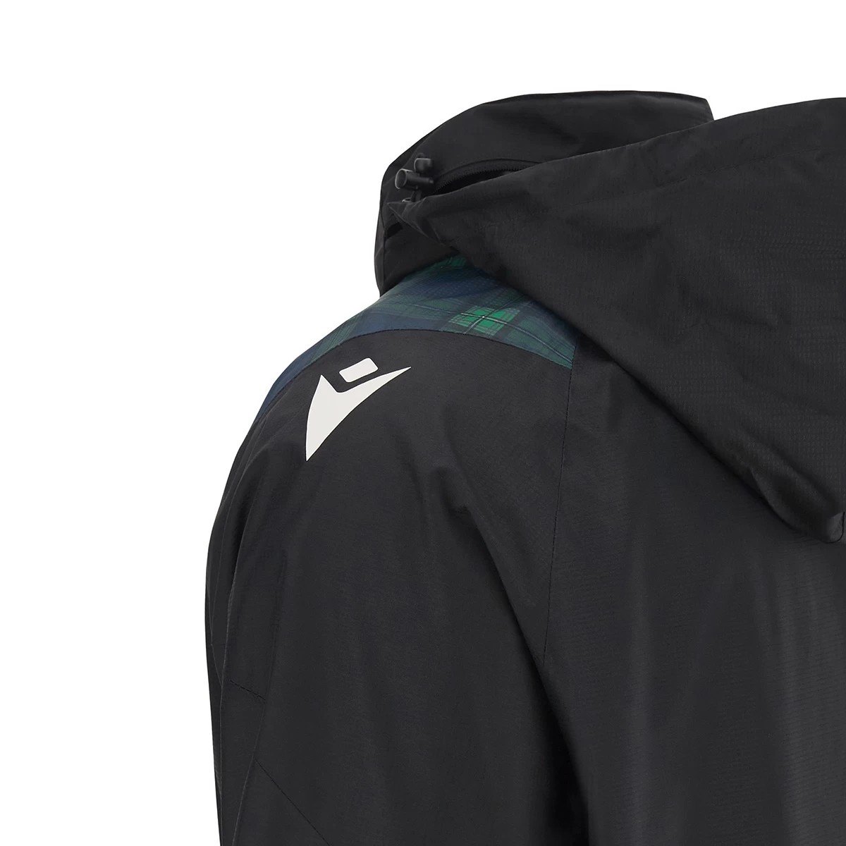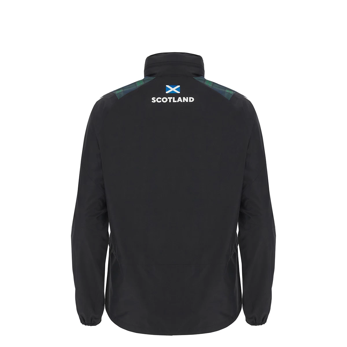 The black waterproof features SRU tartan panels on each shoulder to match this season’s kit. The detailing on the upper chest proudly shows off the printed Scottish Rugby Union and Macron logos. jacket has a micromesh lining which makes it ideal for layering on game-day. The jacket has two zip pockets to keep your valuables safe, as well as an aeration opening on the back of the jacket to ensure breathability. The back of the jacket also has a printed Scotland flag and lettering at the bottom of the neck, making it perfect for a complete, classic look.