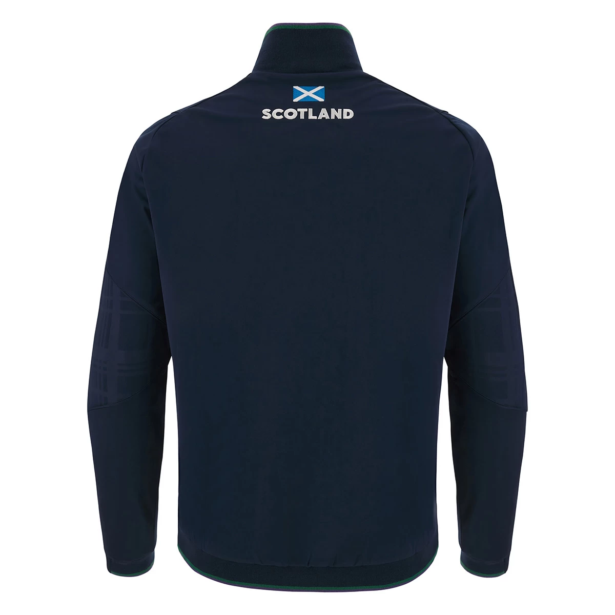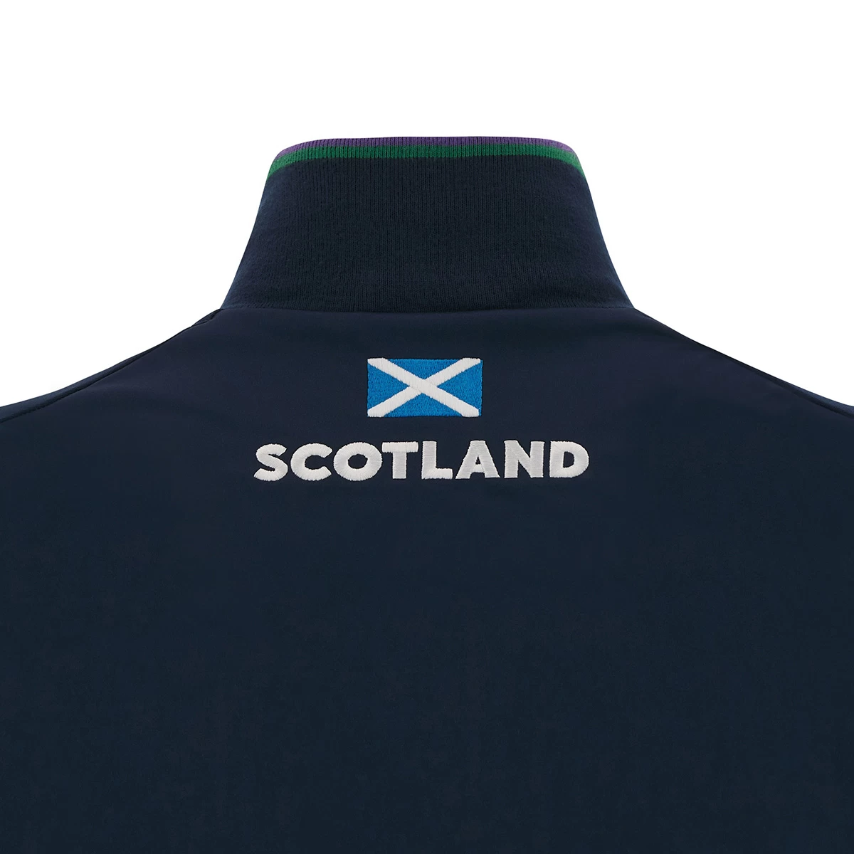 This Macron Scotland Mens Anthem Jacket is built to keep you warm all season long while supporting the Scottish rugby team from the Murrayfield and beyond. The classic navy anthem jacket is made from softshell and poly-diagonal fabric with rib knit white cuffs, collar and hem to keep warmth inside on colder game days.