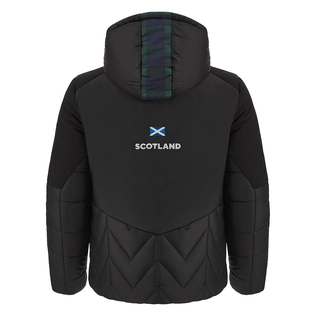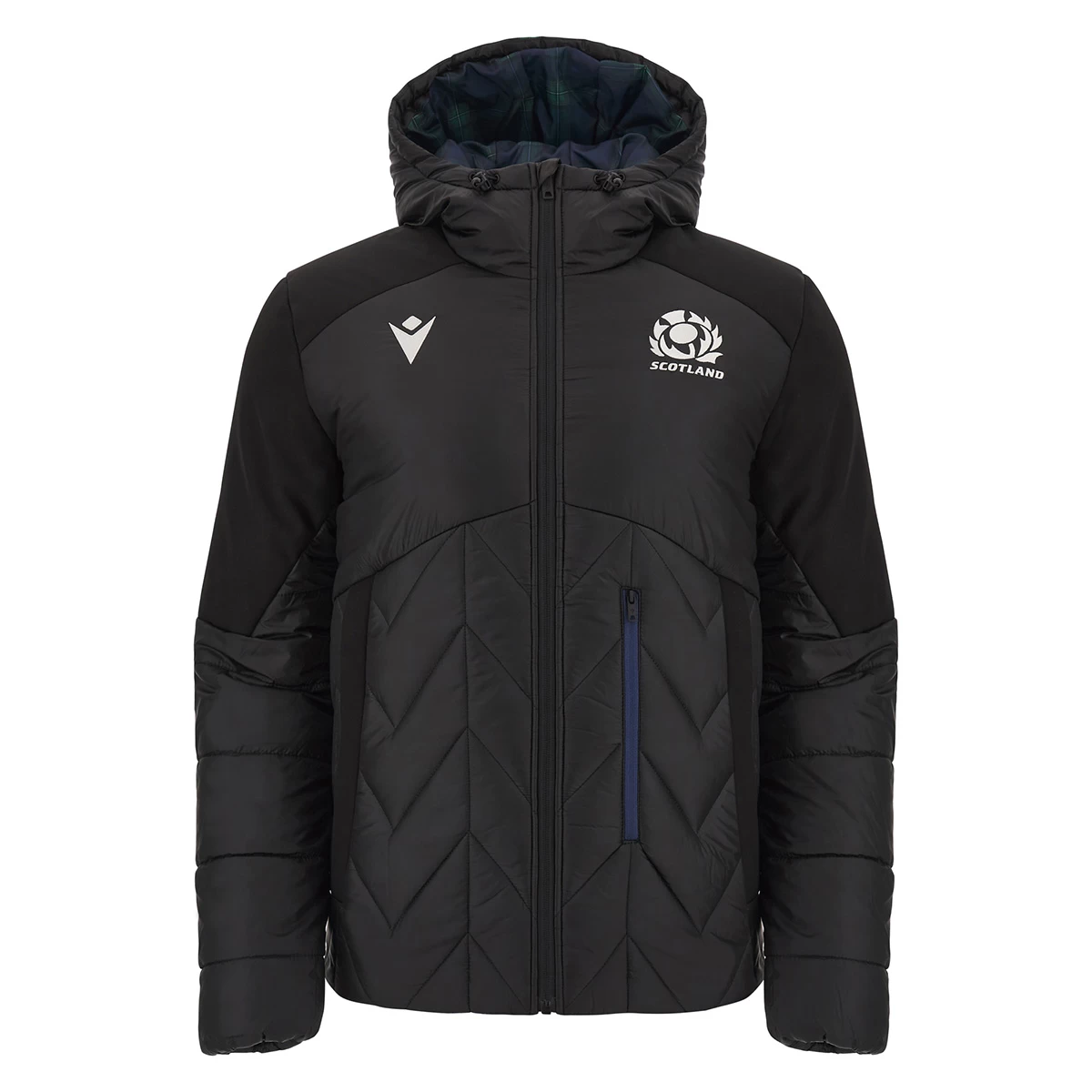 The black bomber jacket features SRU tartan detailing on the inside and outside of the hood to match this season’s kit. The detailing on the upper chest proudly shows off the embroidered Scottish Rugby Union and Macron logos. The jacket has a zip pocket to keep your valuables safe. The back of the jacket also has an embroidered Scotland flag and lettering at the bottom of the neck, making it perfect for a complete, classic look.