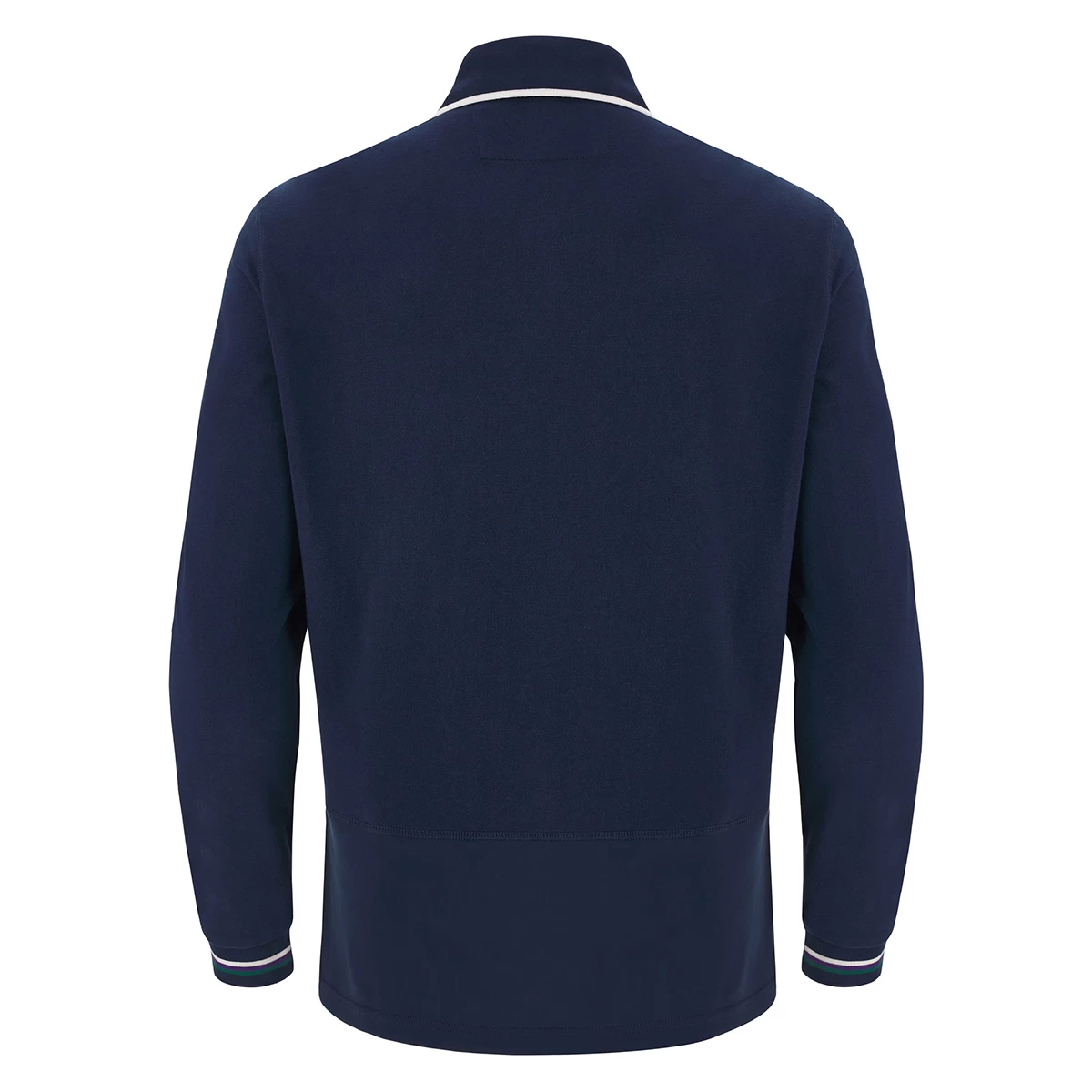 The long-sleeved navy rugby shirt is made from 100% recycled polyester eco-fabric material for durability and comfort while supporting the team. The upper chest of the shirt proudly shows off the embroidered Scottish Rugby logo over the heart alongside the Rugby World Cup and Macron logos on the upper chest. The Scotland flag is also featured on the sleeve of the shirt.