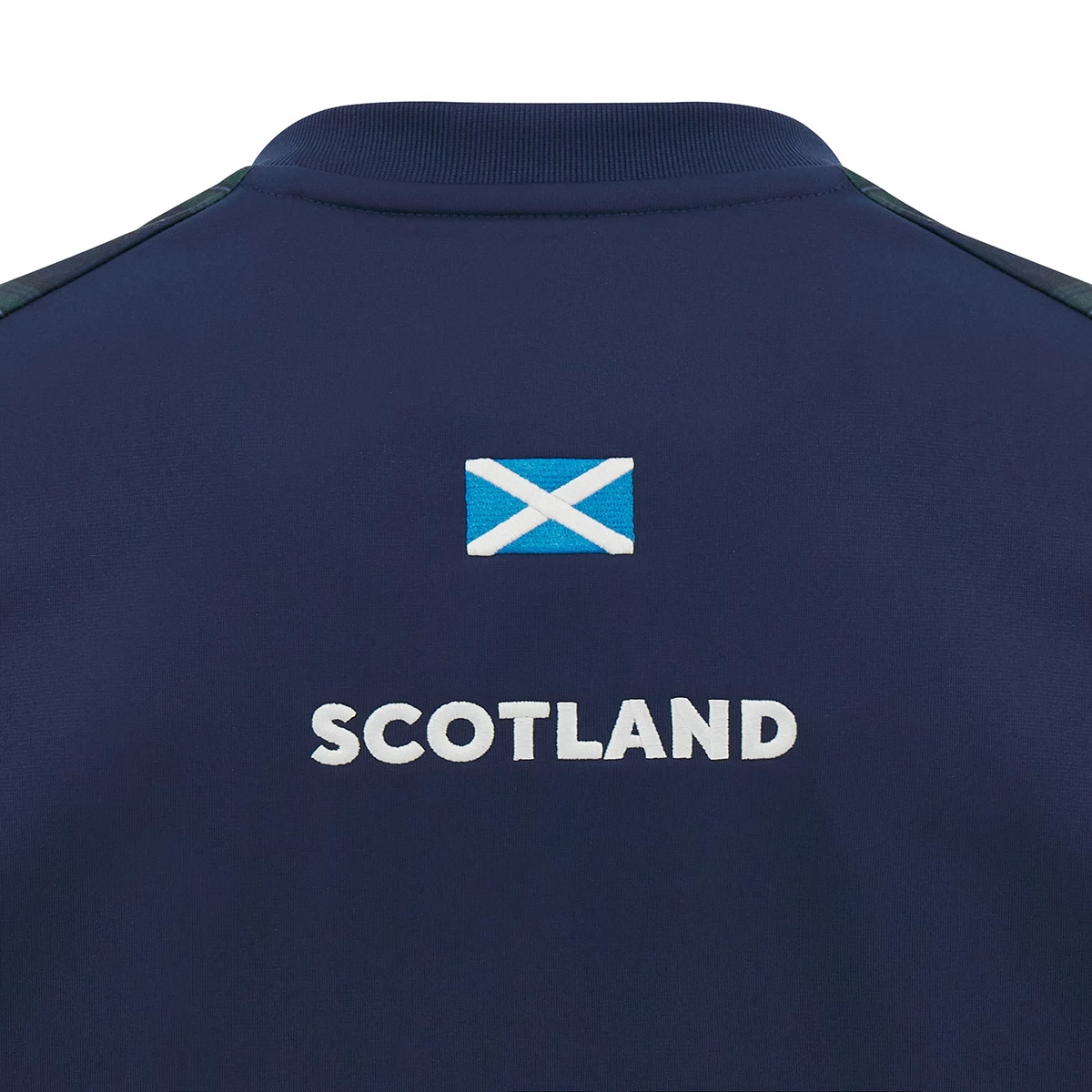 The sweatshirt features navy detailing and showcases the SRU tartan on each shoulder to match this season’s kit. The upper chest of the sweatshirt proudly shows off the embroidered Scottish Rugby Union logo over the heart and the Macron logo on the upper right chest. The back of the sweatshirt also has an embroidered Scotland flag and lettering at the bottom of the neck.