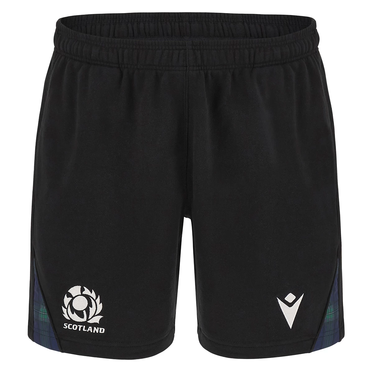The black travel shorts feature piping and SRU tartan panels to match this season’s kit. The detailing on the lower thigh proudly shows off the embroidered Scottish Rugby Union and Macron logos. The waistband is elasticated with a drawstring for optimum comfort and a perfect fit.