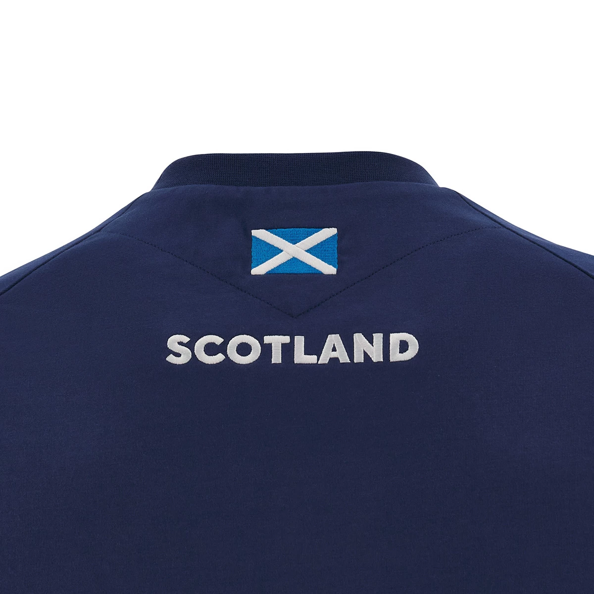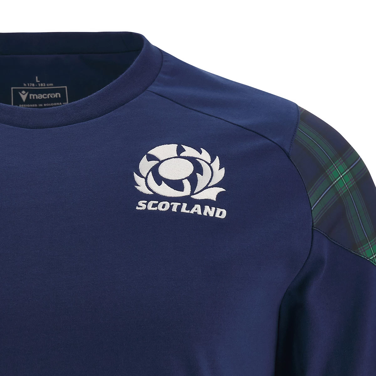 The navy T-shirt features SRU tartan detailing on the shoulders to match this season’s kit. The detailing on the upper chest proudly shows off the embroidered Scottish Rugby Union and Macron logos. The back of the T-Shirt also has an embroidered Scotland flag and lettering at the bottom of the neck, making it perfect for a complete, classic look.