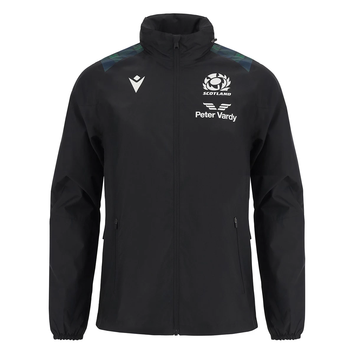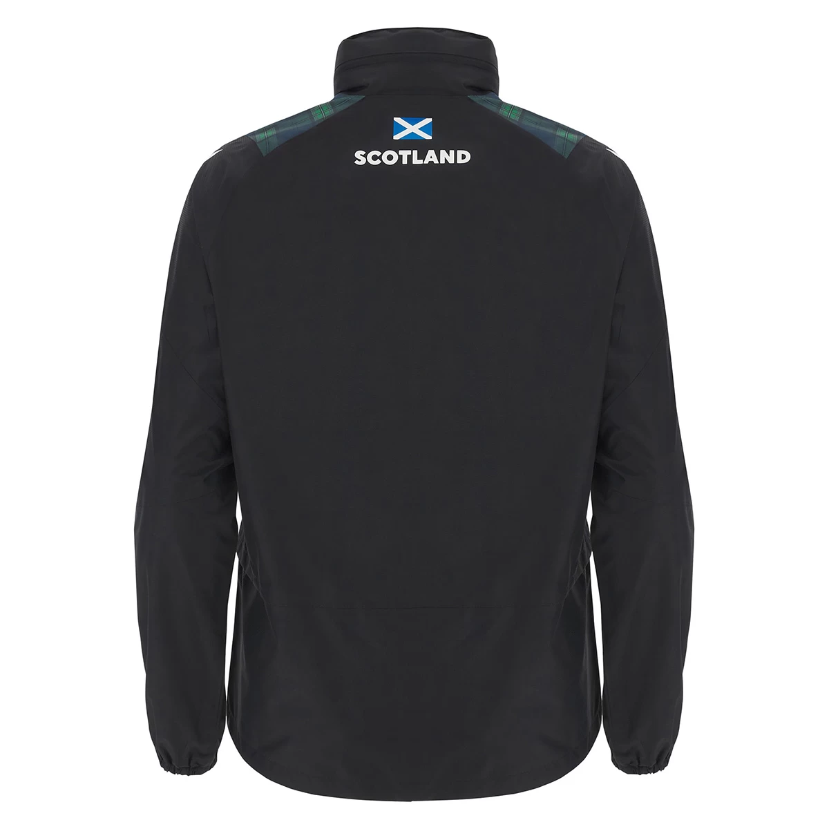 The black waterproof features SRU tartan panels on each shoulder to match this seasonβs kit. The detailing on the upper chest proudly shows off the printed Scottish Rugby Union and Macron logos. The jacket has a micromesh lining which makes it ideal for layering on game-day. The jacket has two zip pockets to keep your valuables safe, as well as an aeration opening on the back of the jacket to ensure breathability. The back of the jacket also has a printed Scotland flag and lettering at the bottom of the neck, making it perfect for a complete, classic look.