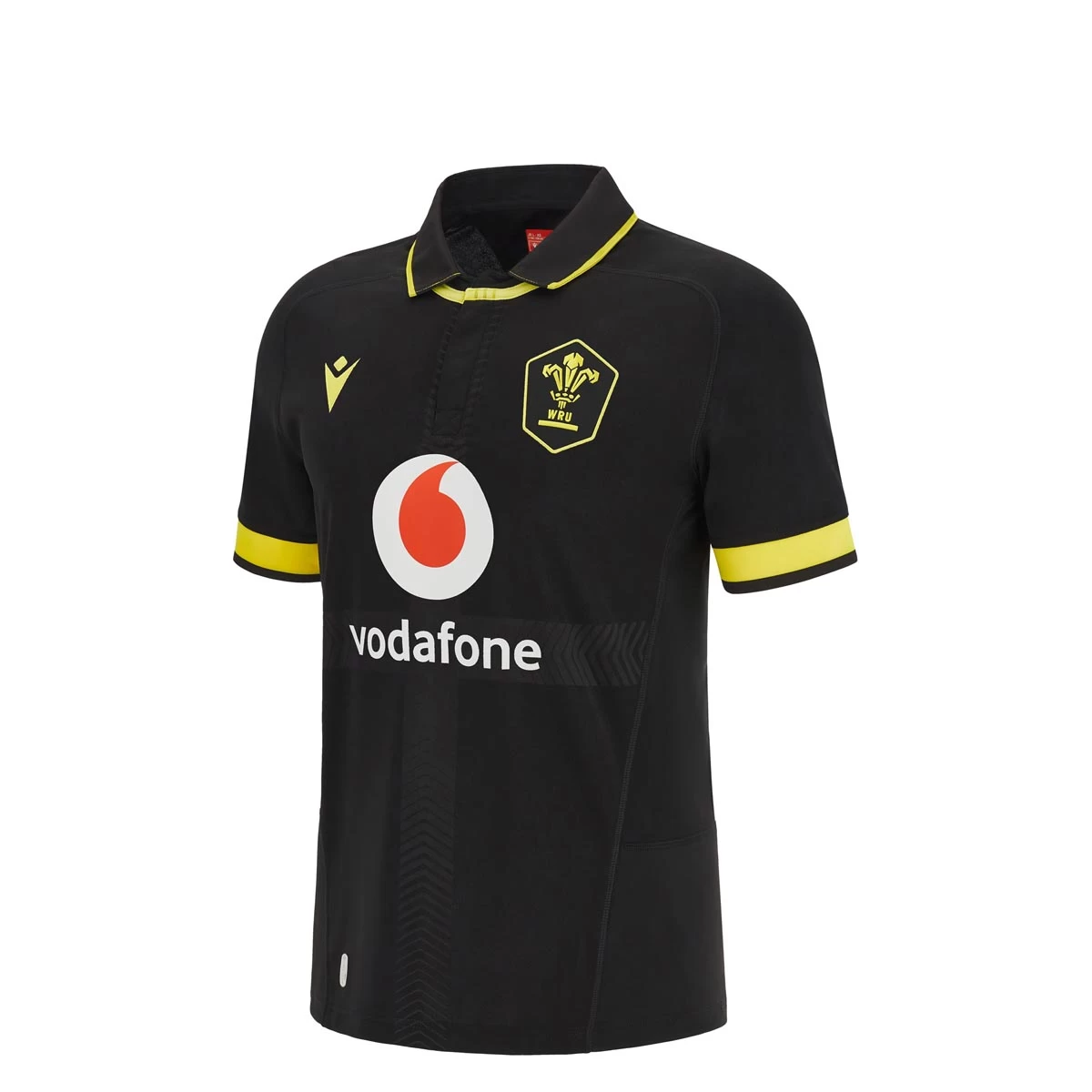 The shirt features a sleek black colourway with yellow details on the collar and sleeve cuffs . The upper chest of the shirt proudly shows off the embroidered Wales Rugby logo over the heart alongside the Macron logo on the upper left chest.
