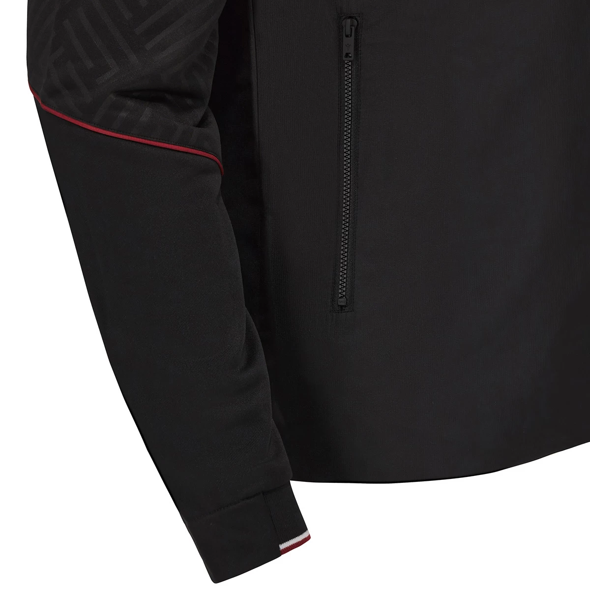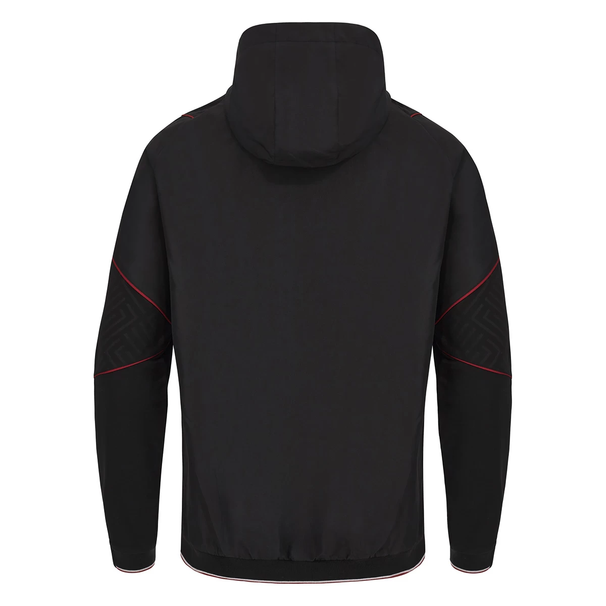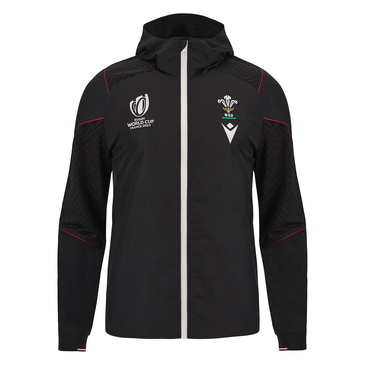 This Macron Wales Mens Rugby World Cup 2023 Travel Full Zip Hoodie in black is ideal for wearing as part of your every-day style while supporting the Wales team all season long. The black full zip hoodie is made from a microfibre and poly-diagonal fabric with a crepe lining to keep you cool and comfortable while supporting the team.