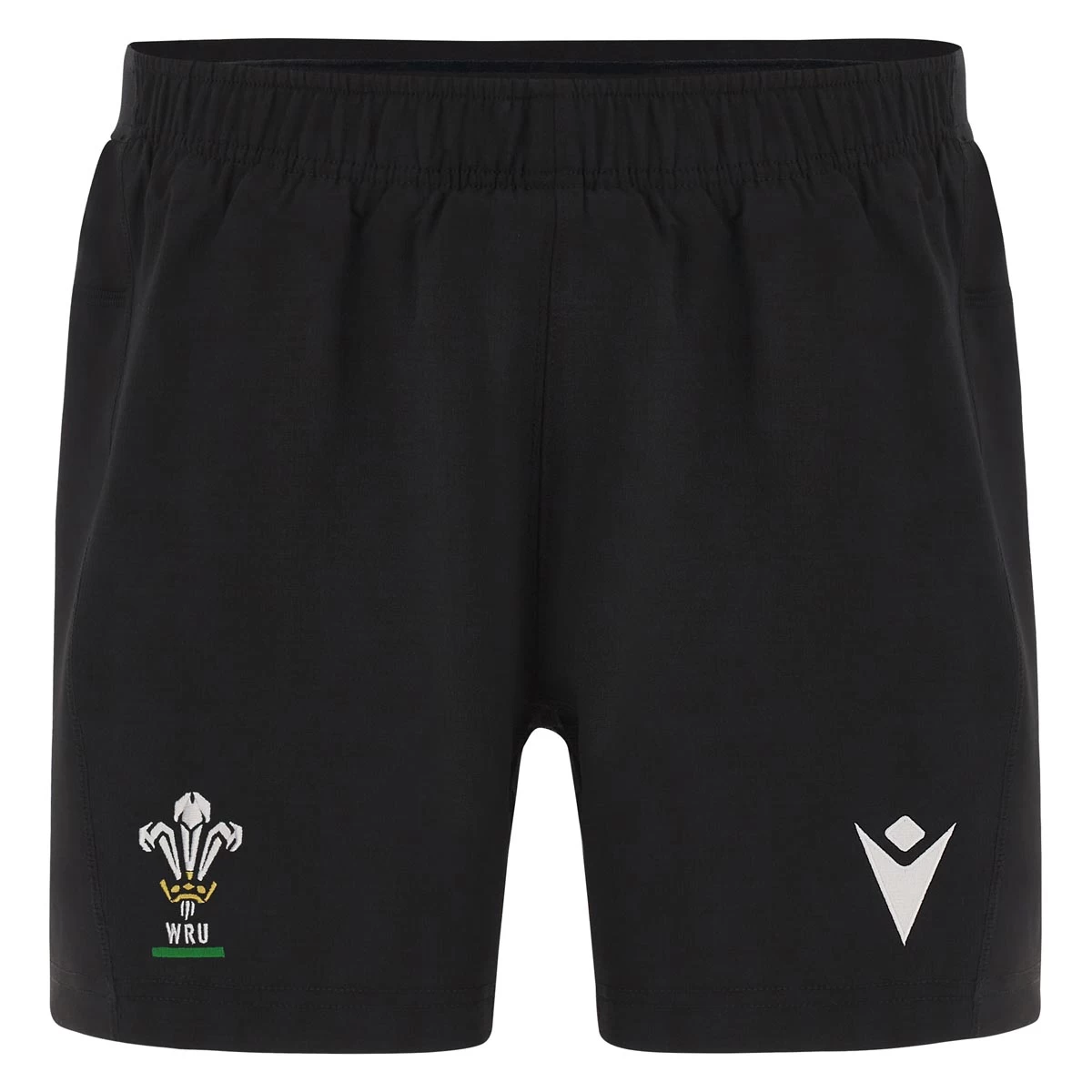 The shorts feature dark red piping and an elasticated waist which can be tightened by a drawstring. The legs of the shorts proudly show off the Welsh Rugby Union and Macron logos.