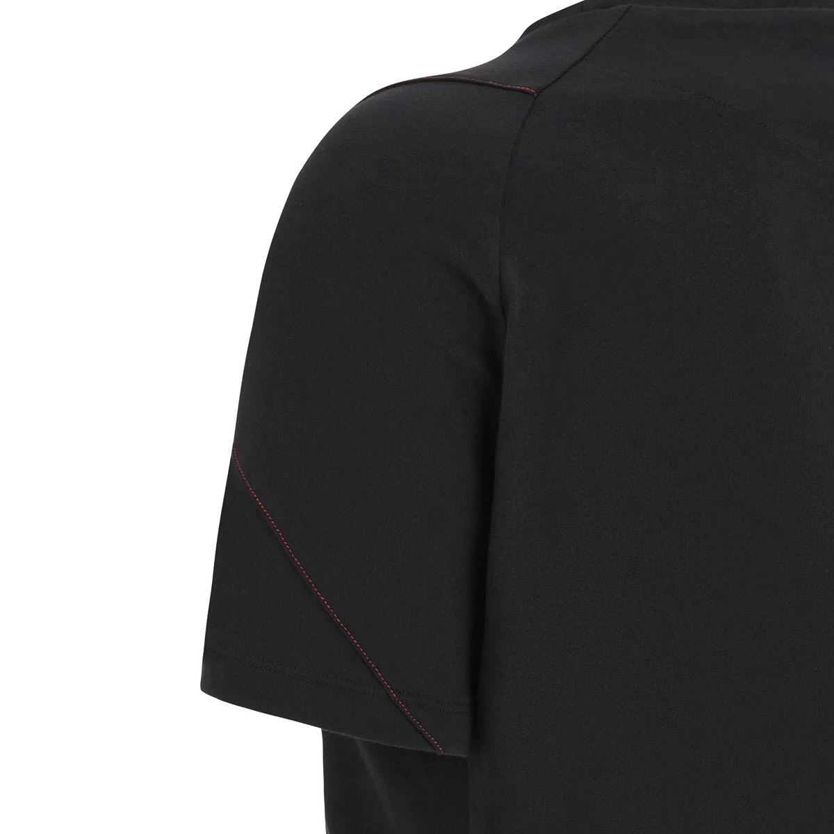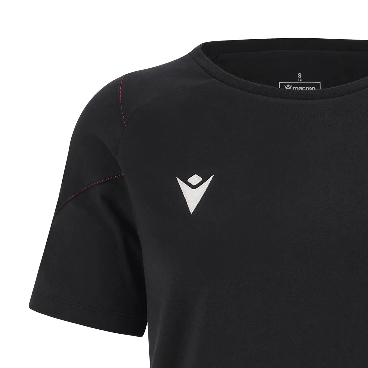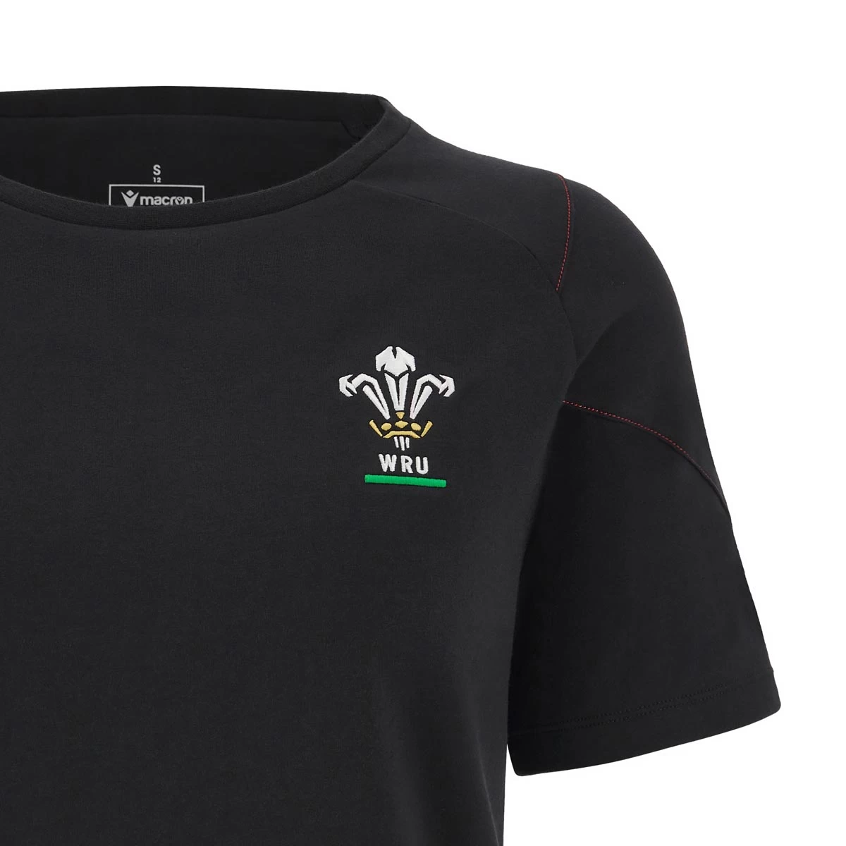 The black, ladies fit T-shirt features dark red piping to match this season’s kit. The detailing on the upper chest proudly shows off the embroidered Welsh Rugby Union and Macron logos. The T-shirt is perfect for a complete, classic look.