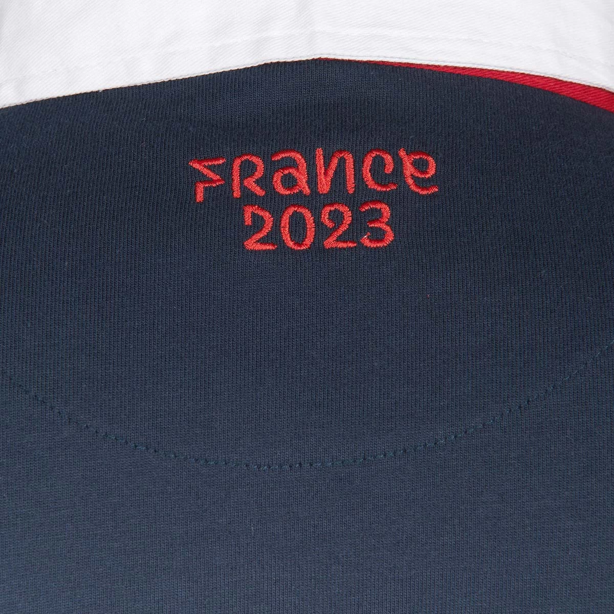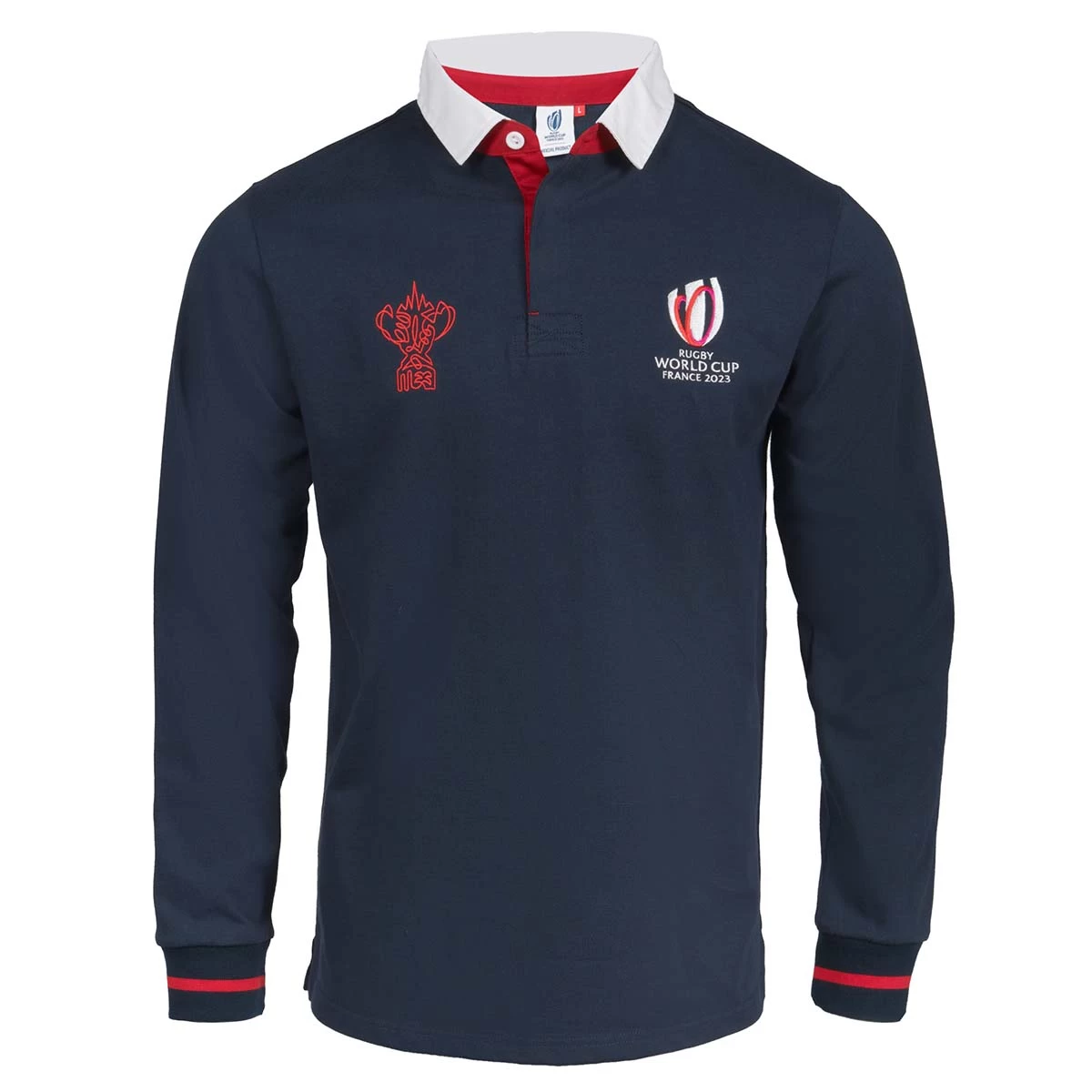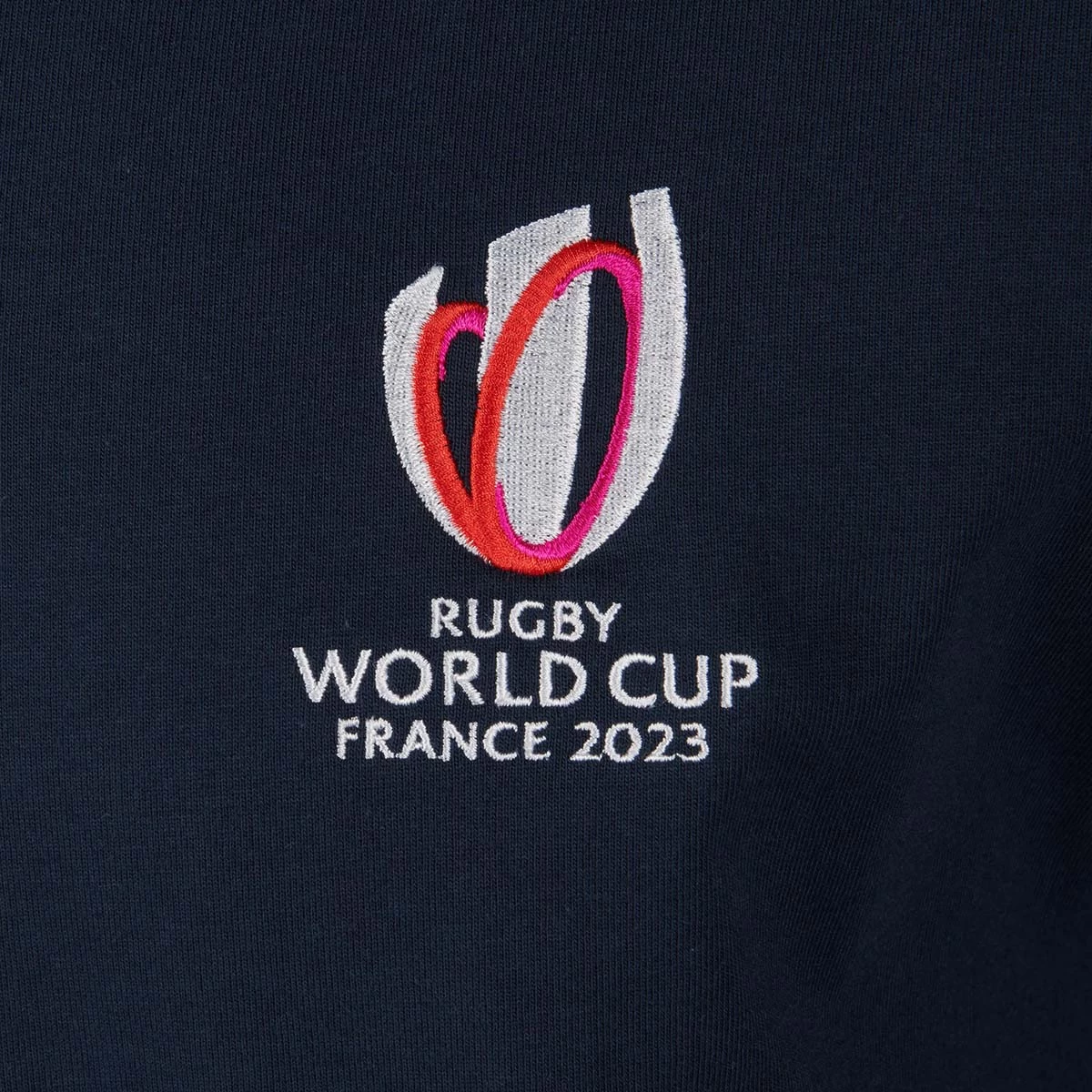 In a classy navy design, the RWC 2023 logo and Webb Ellis Cup have been embroidered onto the upper chest of this supporters rugby jersey.