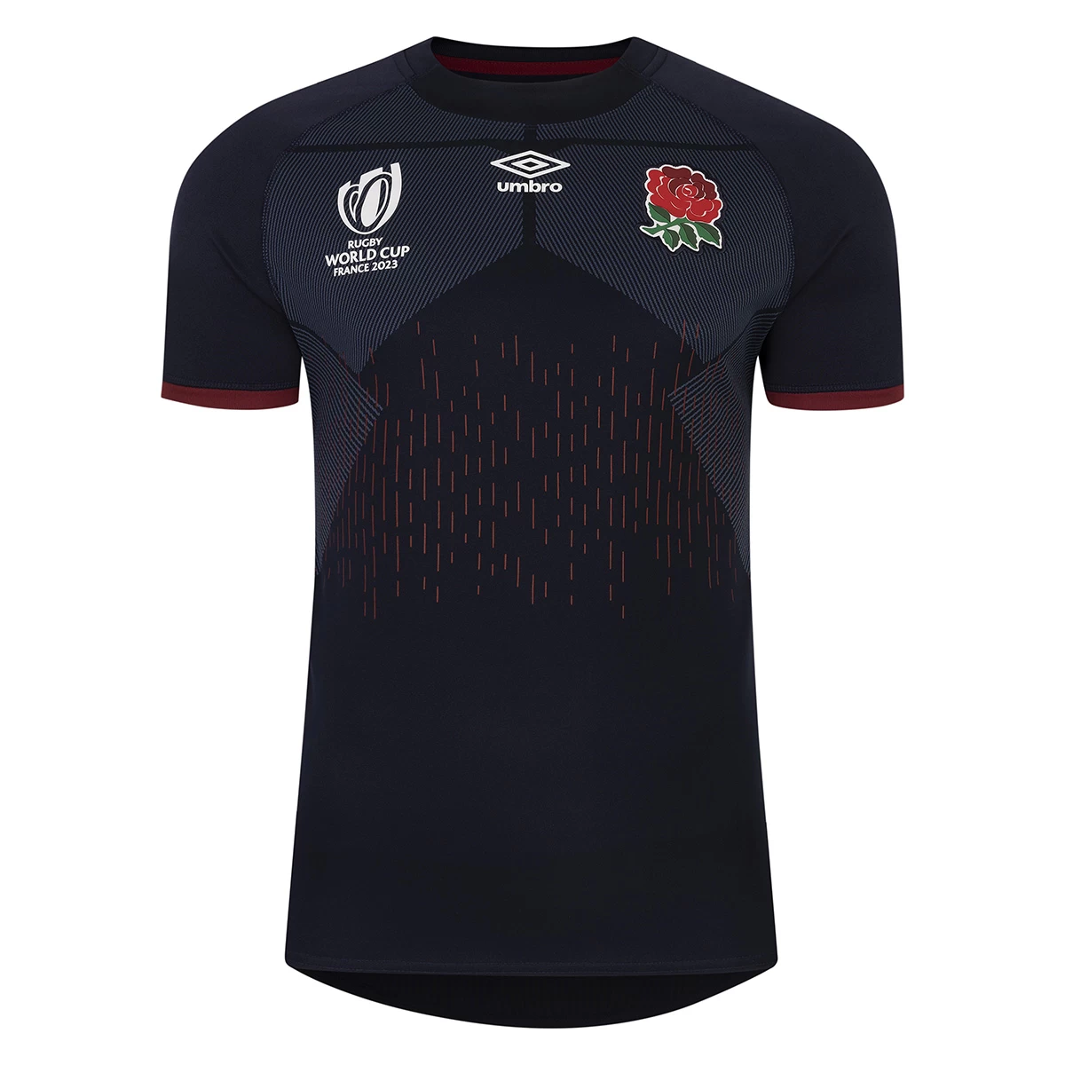 The short-sleeved shirt features a rib panelled crew neckline and a dropped back hem. The upper chest of the shirt proudly shows off the England Rugby logo over the heart alongside the Umbro and Rugby World Cup logos.