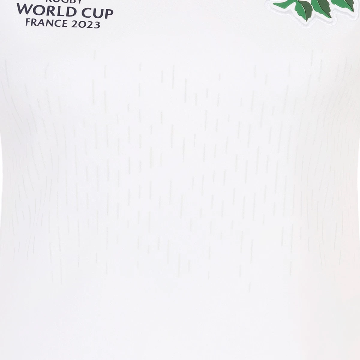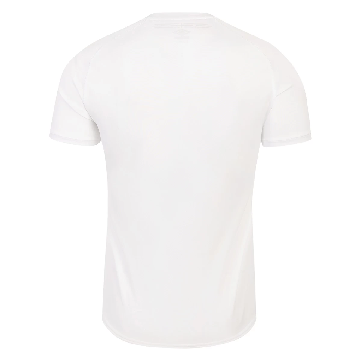 The short-sleeved shirt features a rib panelled crew neckline and a dropped back hem. The upper chest of the shirt proudly shows off the England Rugby logo over the heart alongside the Umbro and Rugby World Cup logos.
