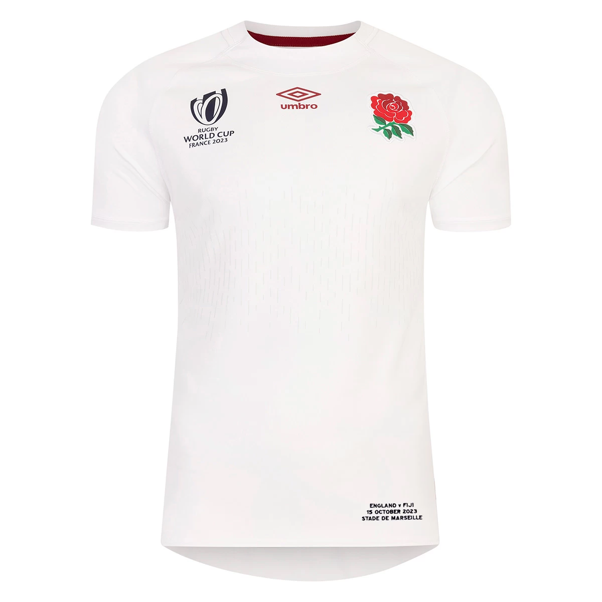 The short-sleeved shirt features a rib panelled crew neckline and a dropped back hem. The upper chest of the shirt proudly shows off the England Rugby logo over the heart alongside the Umbro and Rugby World Cup logos.