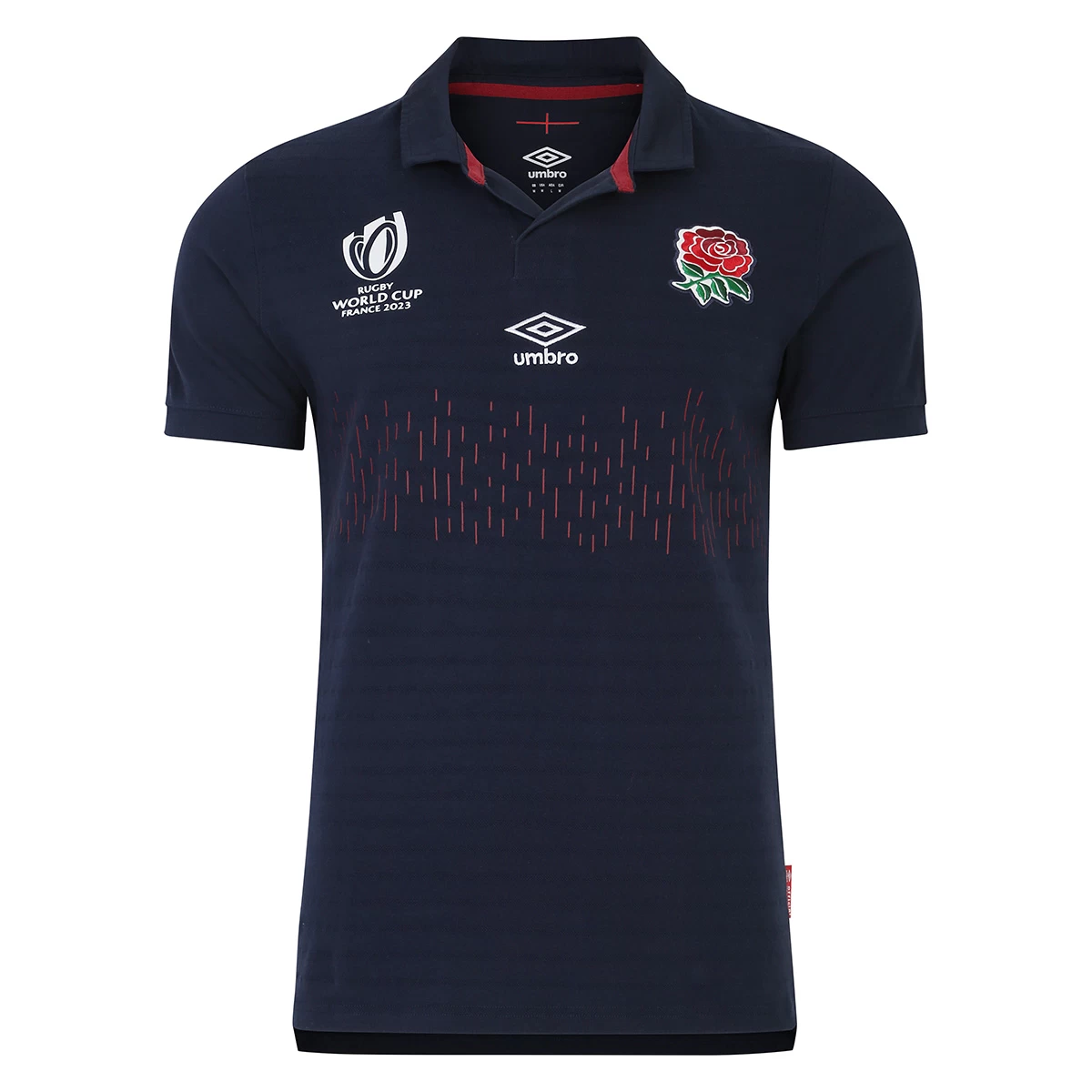 The short-sleeved shirt features a twill fixed placket and fold over collar and a dropped back hem. The upper chest of the shirt proudly shows off the England Rugby logo over the heart alongside the Umbro and Rugby World Cup logos.
