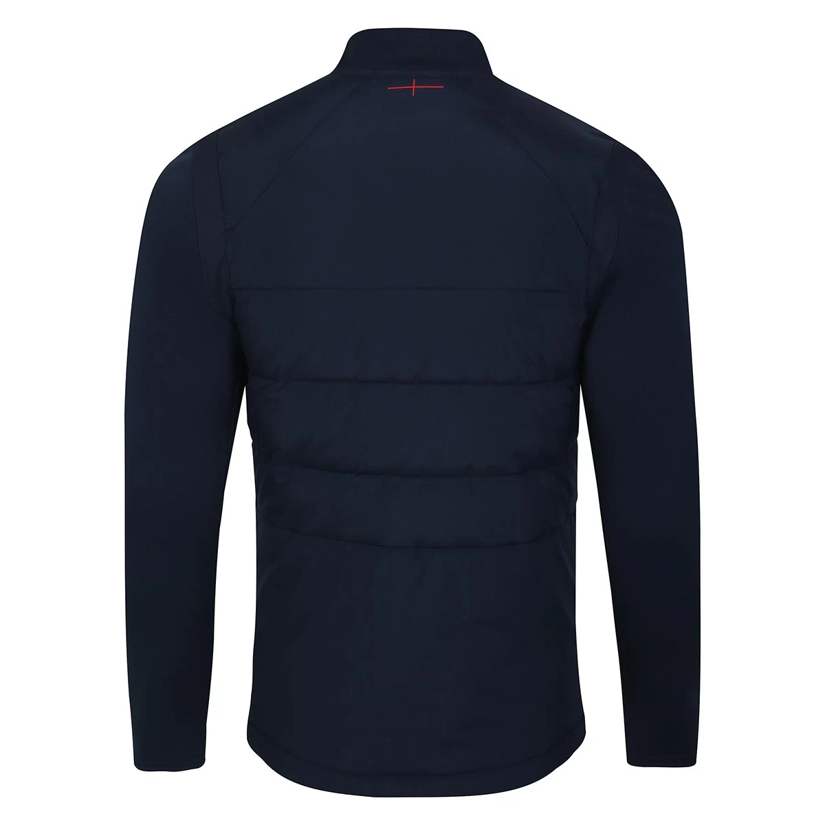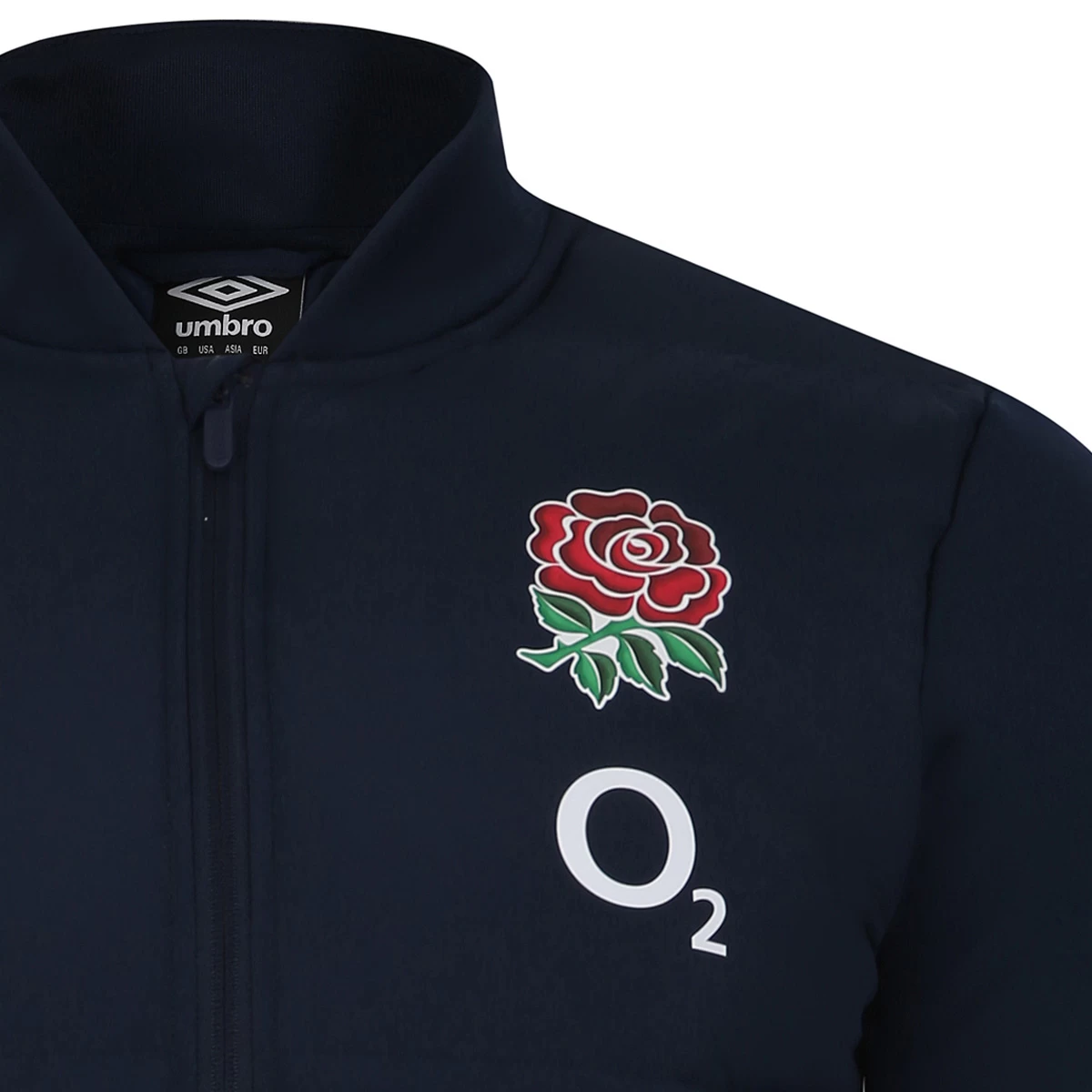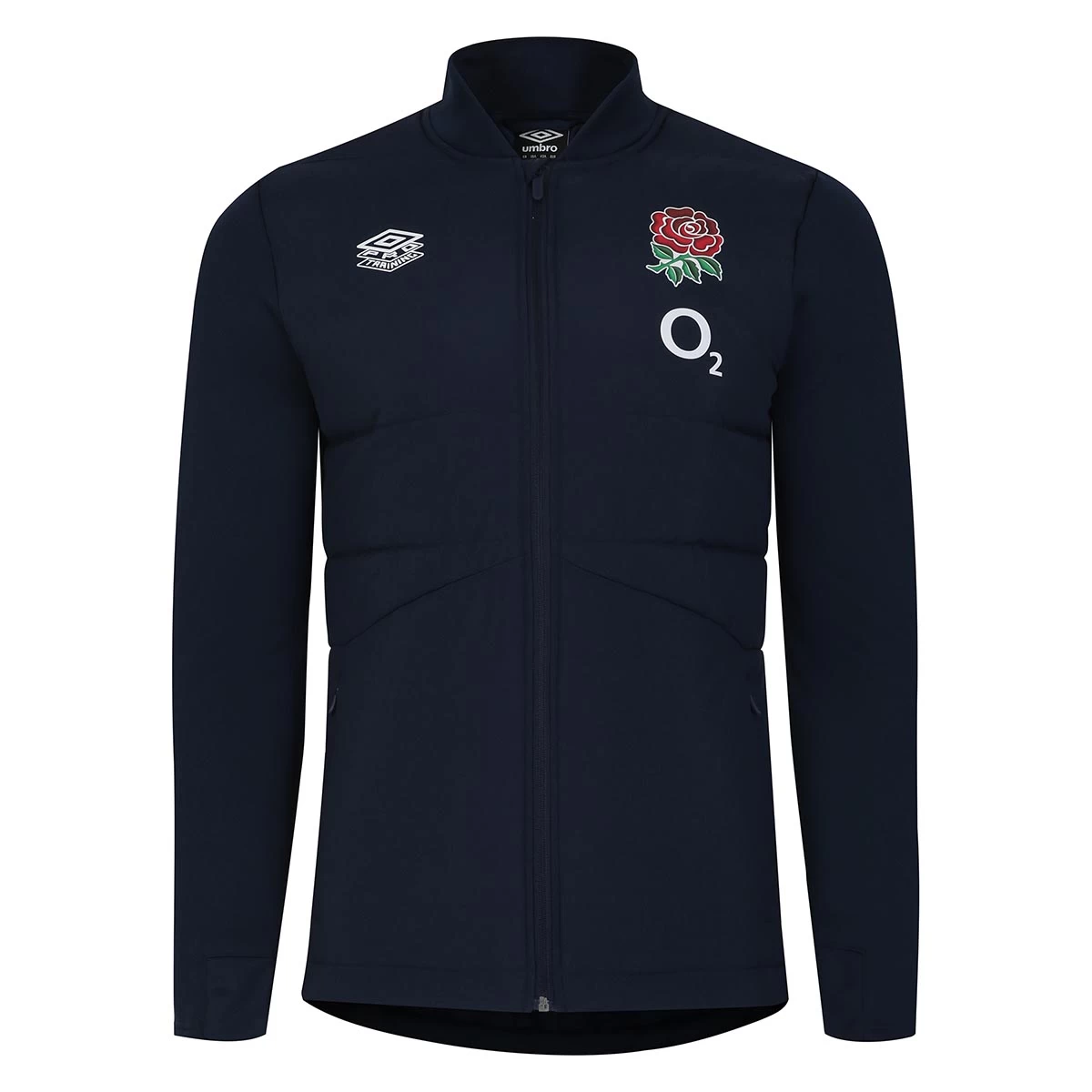 The jacket features an insulated design with a pique fleece inner to keep you warm during those colder games this season. The knit sleeves and inner rib collar and cuff keep the heat inside. The jacket also has angular panels with concealed zip pockets to keep your valuables safe. The upper chest of the jacket proudly shows off the England Rugby logo over the heart alongside the Umbro logo on the upper left chest.