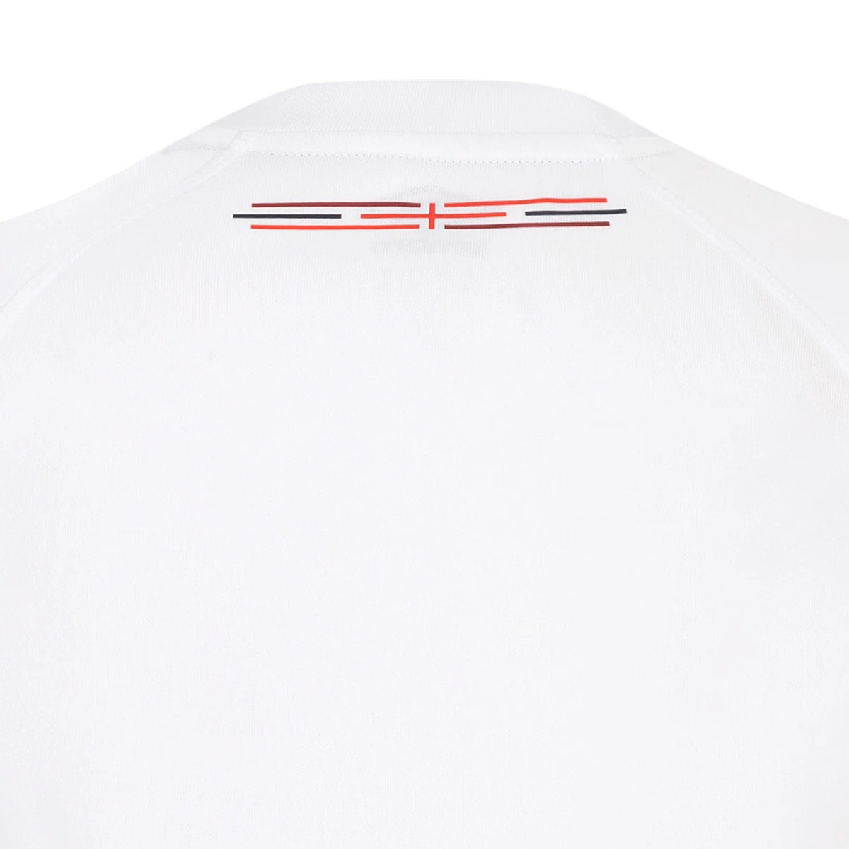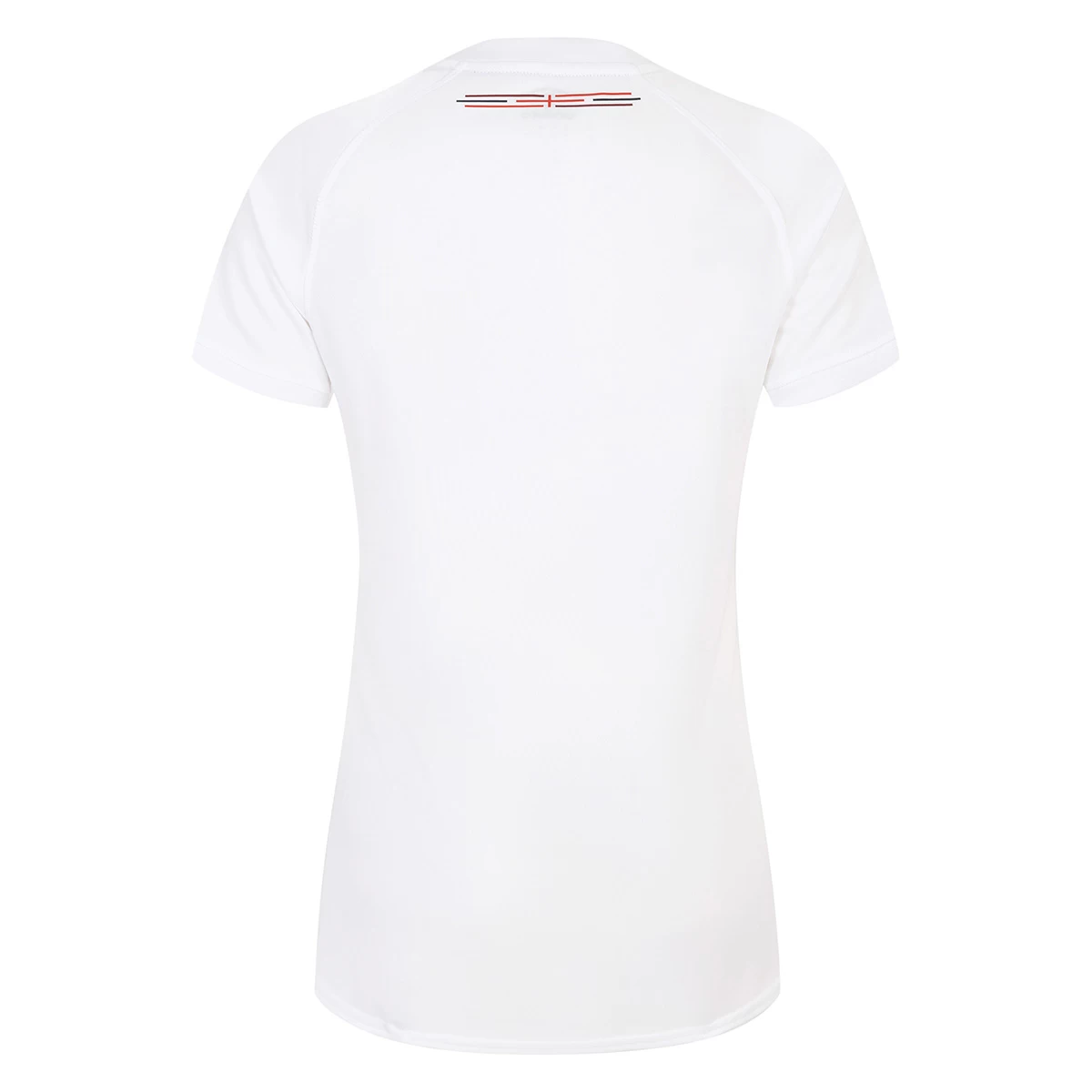 The ladies fit, white rugby shirt is made from 100% polyester for durability and comfort while supporting the team. The shirt features a rib panelled crew neckline and a dropped back hem. The upper chest of the shirt proudly shows off the England Rugby logo over the heart alongside the Umbro logo on the upper left chest with the O2 sponsor in the middle.