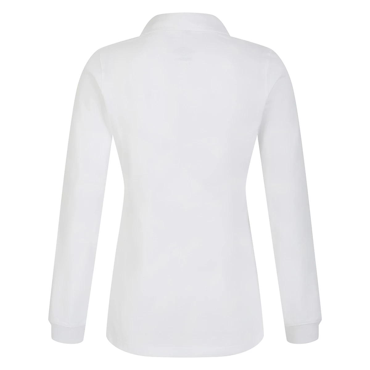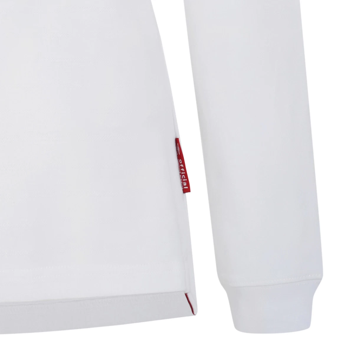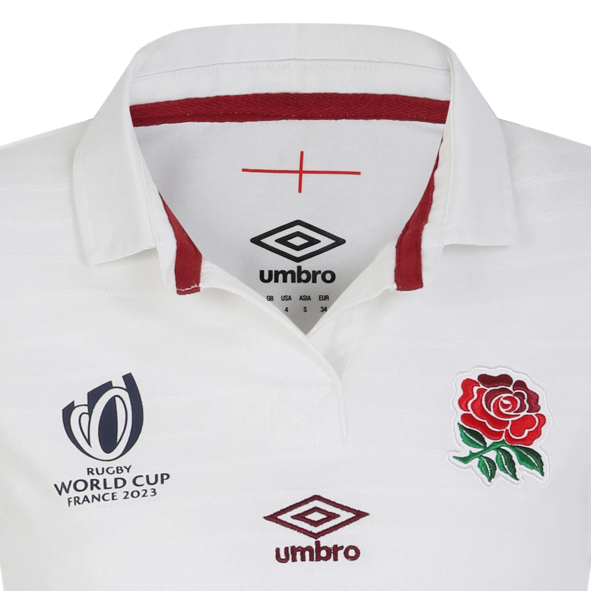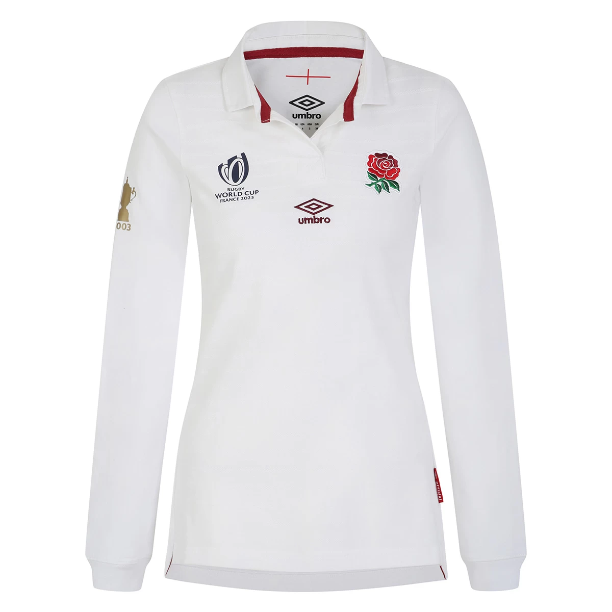 The long-sleeved, ladies fit shirt features a twill fixed placket and fold over collar and a dropped back hem The upper chest of the shirt proudly shows off the England Rugby logo over the heart alongside the Umbro and Rugby World Cup logos.