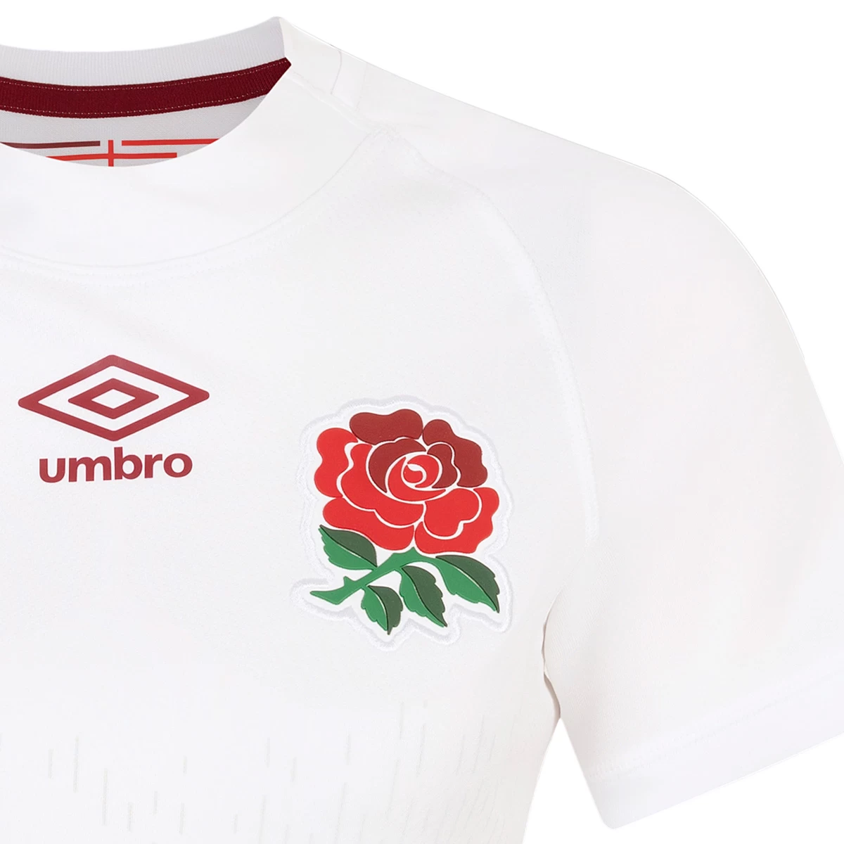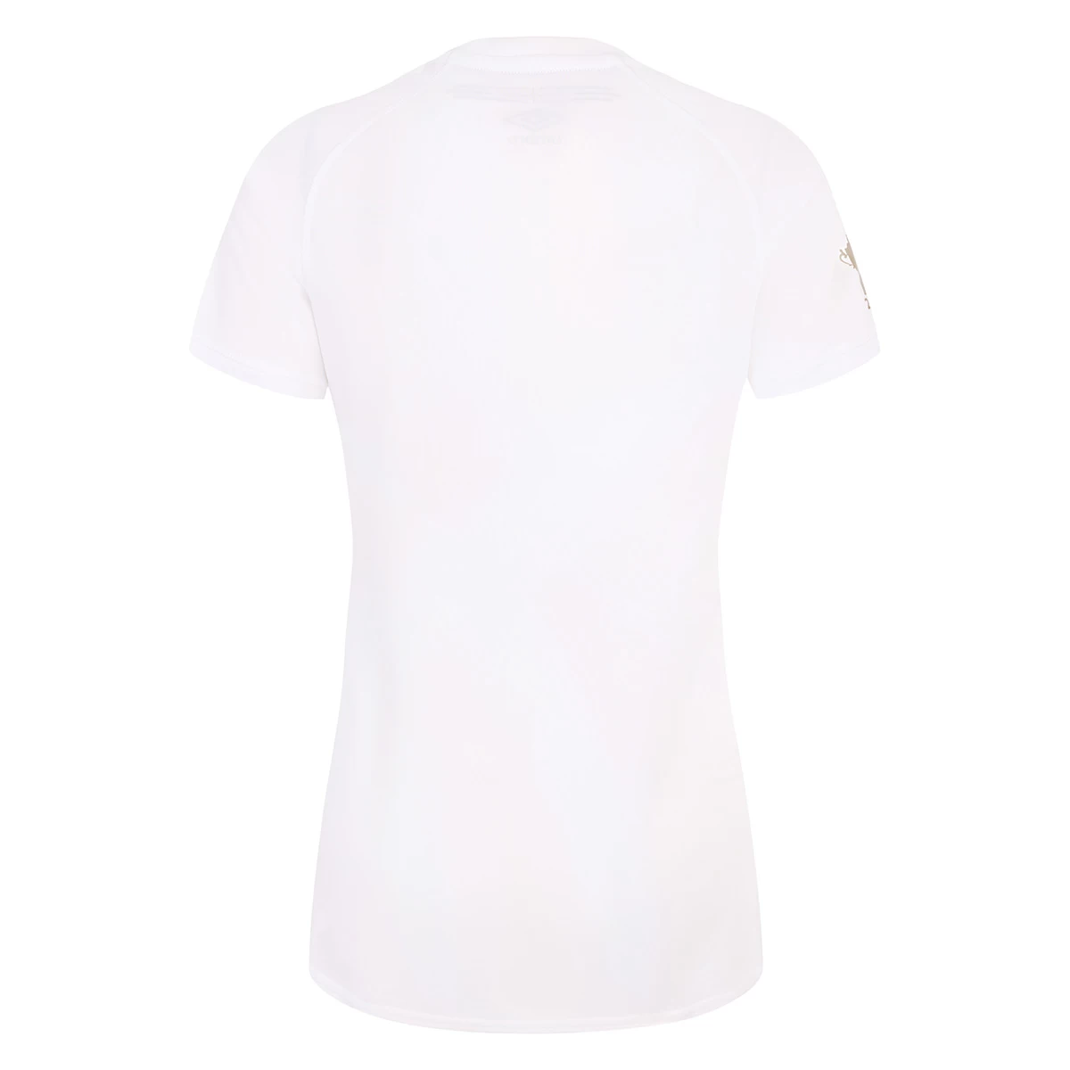 The short-sleeved, ladies fit shirt features a rib panelled crew neckline and a dropped back hem. The upper chest of the shirt proudly shows off the England Rugby logo over the heart alongside the Umbro and Rugby World Cup logos.