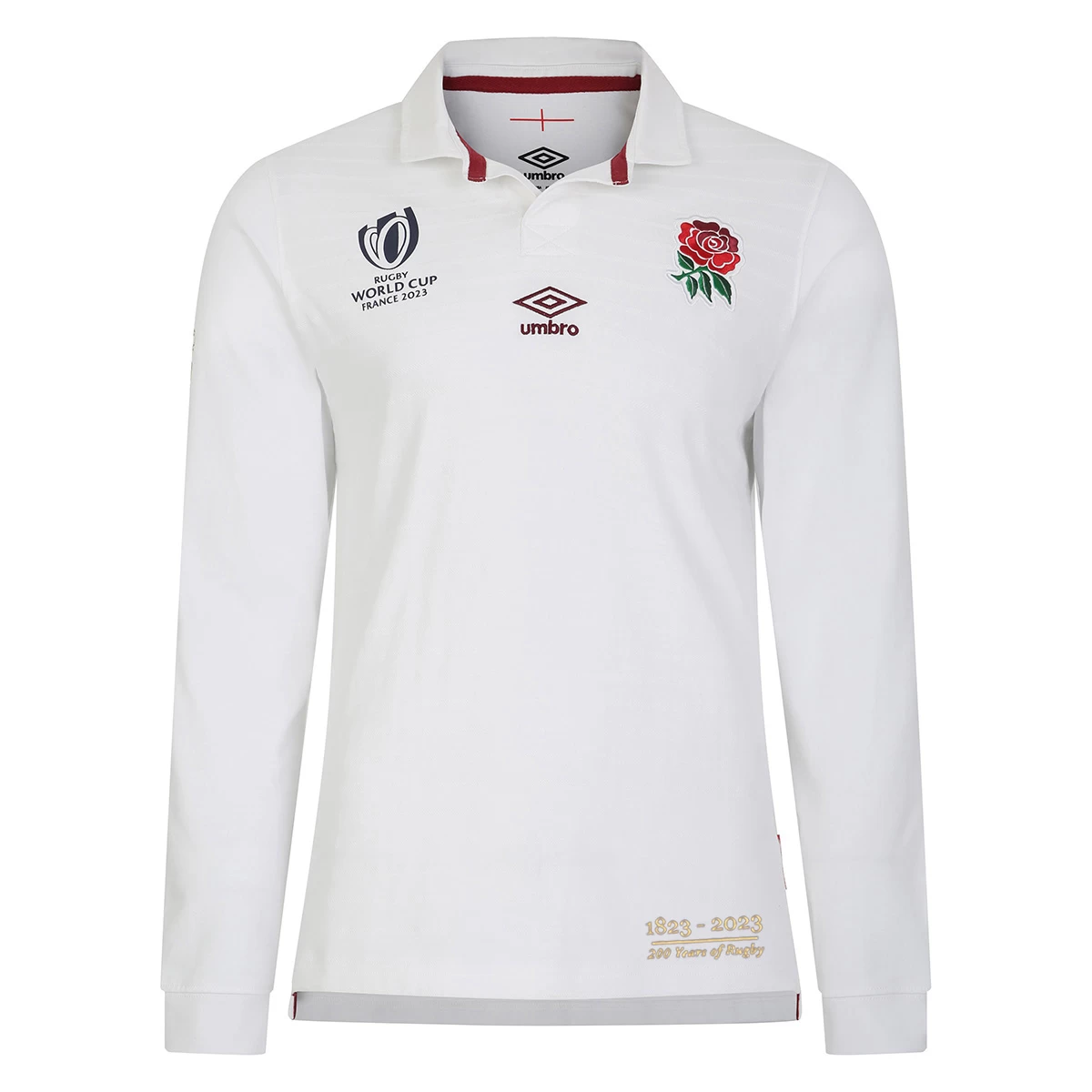 The long-sleeved shirt features a twill fixed placket and fold over collar and a dropped back hem. The upper chest of the shirt proudly shows off the England Rugby logo over the heart alongside the Umbro and Rugby World Cup logos.