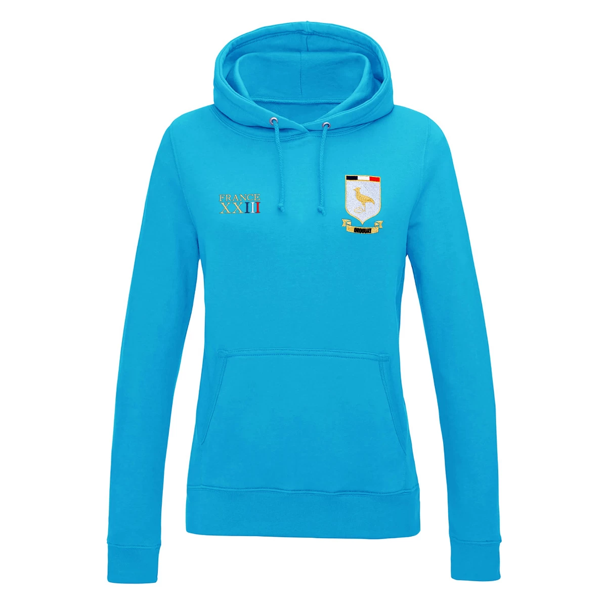 Made with a thick polycotton blend, this France XXIII Collection hoodie is ideal for supporting the Uruguay rugby team in the World Cup this year! This hoodie provides a classic fit and is comfortable and perfect for layering. It features a drawstring hood and kangaroo pouch with ribbed cuffs. The light blue hoodie proudly displays the Uruguay crest and the France XXIII Collection logo.